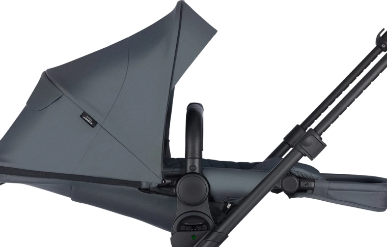 Het extra grote zonnekapje met kijkvenster en waterafstotende afwerking beschermt tegen zon en regen. Een ritsverlenging en mesh-panelen verbeteren de luchtcirculatie.