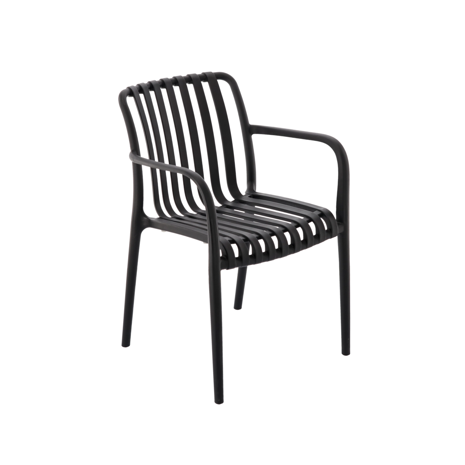 Stijlvolle en duurzame tuinstoel in elegante zwarte kleur van hoogwaardige kunststof met UV-filter. Perfect voor tuin, terras en balkon, biedt een ergonomische vorm voor comfortabel zitten, is weerbestendig en gemakkelijk te reinigen. Maximale draagkracht 110 kg.
