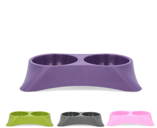 De dubbele constructie bespaart ruimte en houdt de voederplek overzichtelijk. Ideale inhoud 2 × 0,25 l voor kleinere honden en katten.