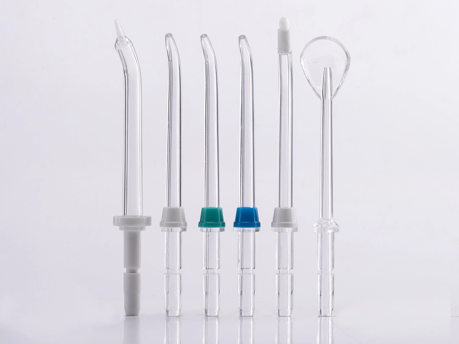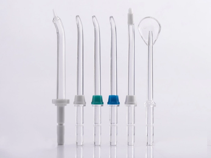 - 6 (3× standaard spuitmond, tongschraper, parodontaal opzetstuk, orthodontisch opzetstuk)