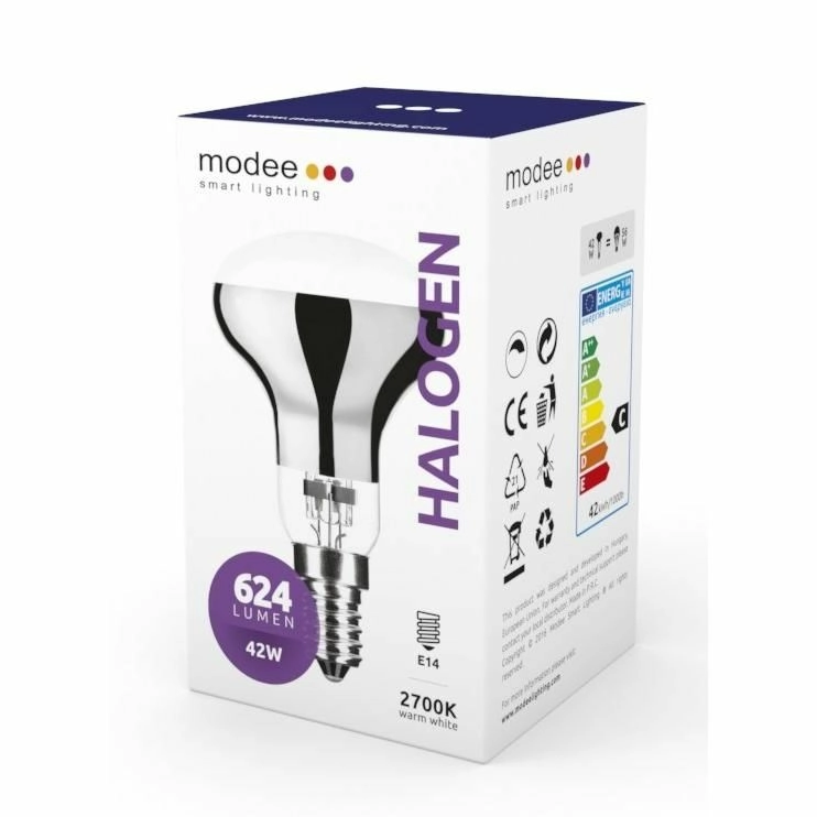 Energiezuinige halogeenlamp R50 met E14-fitting en een vermogen van 42 W biedt direct volle helderheid, dimbare lichtstroom van 624 lm en warm wit licht van 2700 K. Dankzij de brede stralingshoek van 120° verlicht hij de ruimte uitstekend en de speciale constructie met IR-reflectie verhoogt de efficiëntie. Energieklasse C, levensduur tot 2000 u.