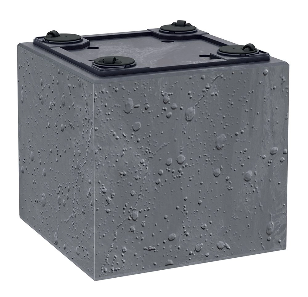De realistische betonlook geeft de ruimte een industriël karakter, terwijl de lichte en duurzame kunststof de plaatsing en het onderhoud vergemakkelijkt.