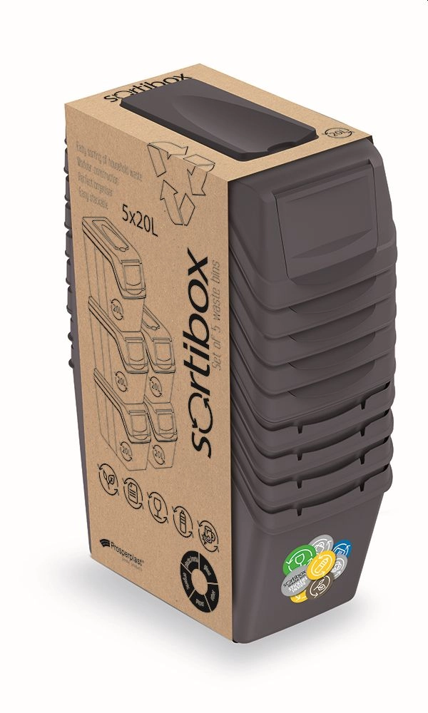 Praktische set van vijf SORTIBOX-sorteerbakken met een inhoud van 5×20 l maakt het scheiden van huishoudelijk afval eenvoudig. Dankzij de modulaire constructie en gemakkelijk stapelbaar bespaar je ruimte en behoud je overzicht. De elegante antracietkleur past perfect in een modern interieur.