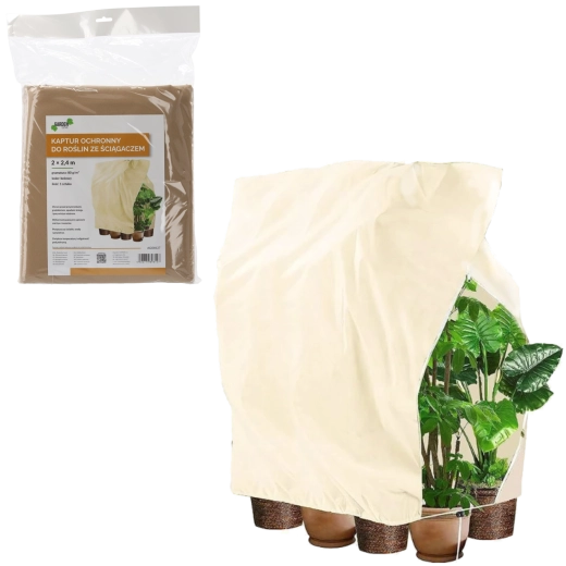 De onderste zoom met trekkoord maakt snelle en dichte bevestiging rond stam of pot mogelijk, zodat de hoes bestand is tegen wind en geen koude tocht naar binnen laat. Het materiaal is meermalig te gebruiken en helpt tevens breuk van bevroren twijgen en het aanhechten van natte sneeuw te voorkomen.