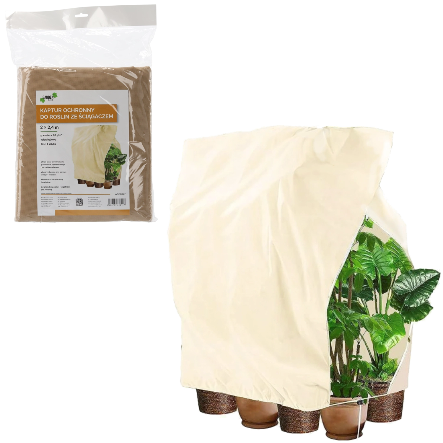 Praktische beschermhoes van agrofolie met een gewicht van 80 g/m² beschermt gevoelige planten betrouwbaar tegen vorst, wind en uitdroging. Dankzij de geïntegreerde trekkoordzoom blijft hij stevig aan de grond zitten en voorkomt opwaaien. Geschikt voor herhaald gebruik, in beige en in het formaat 2 × 2,4 m.