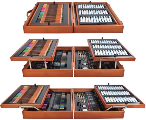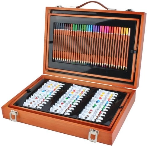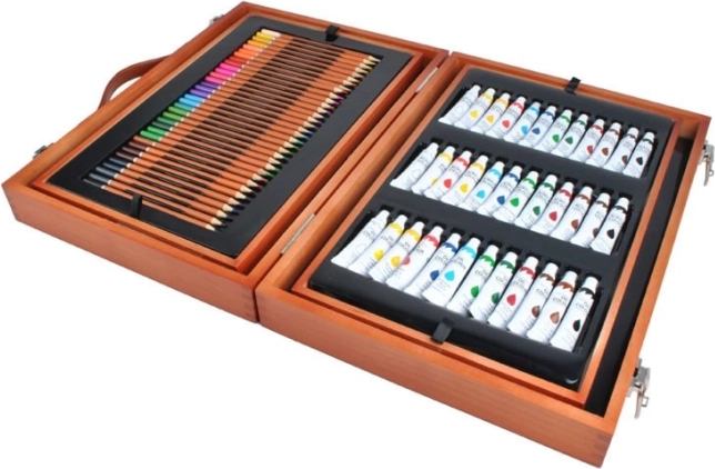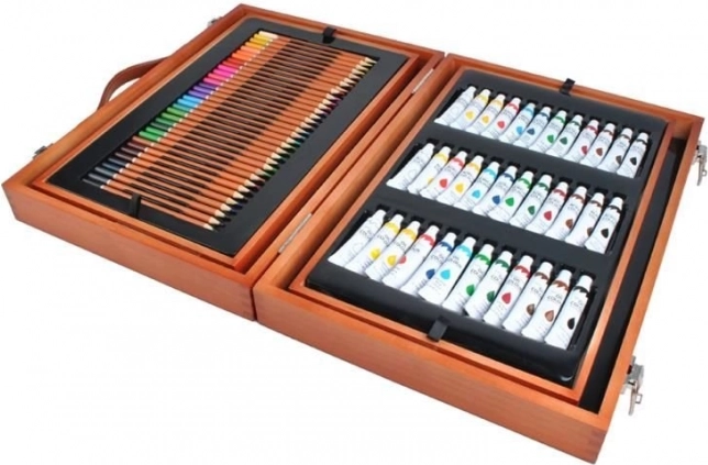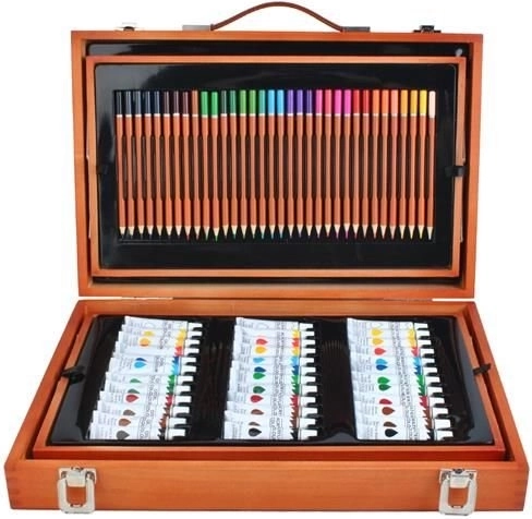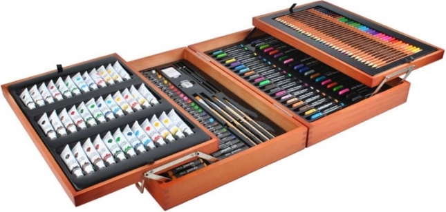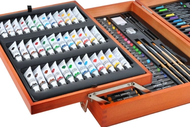 Grote tekenset met 177 stuks, ideaal voor kleine en grote kunstenaars. Dankzij de stevige houten koffer met sluitingen blijft alles op zijn plaats, wat zorgt voor een veilige transport.
