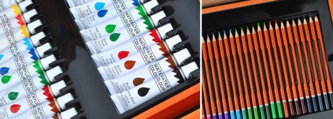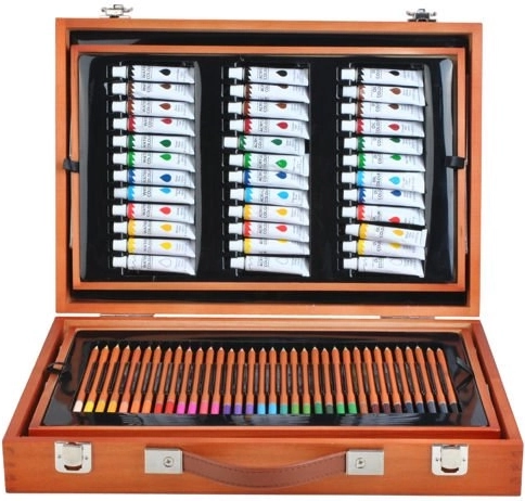 Verrijk je artistieke uitrusting met deze geweldige schilderkit met kleurpotloden, markers, aquarellen en olieverven. Krijg kwaliteit en duurzaamheid dankzij de stevige houten koffer met praktische handgreep en sluitingen voor gemakkelijk transport en veilige opslag. Ieder element heeft zijn plek, wat garandeert dat alles georganiseerd en klaar voor gebruik blijft.
