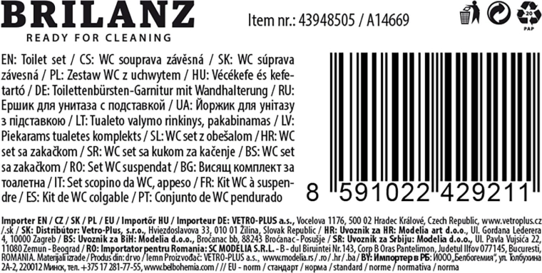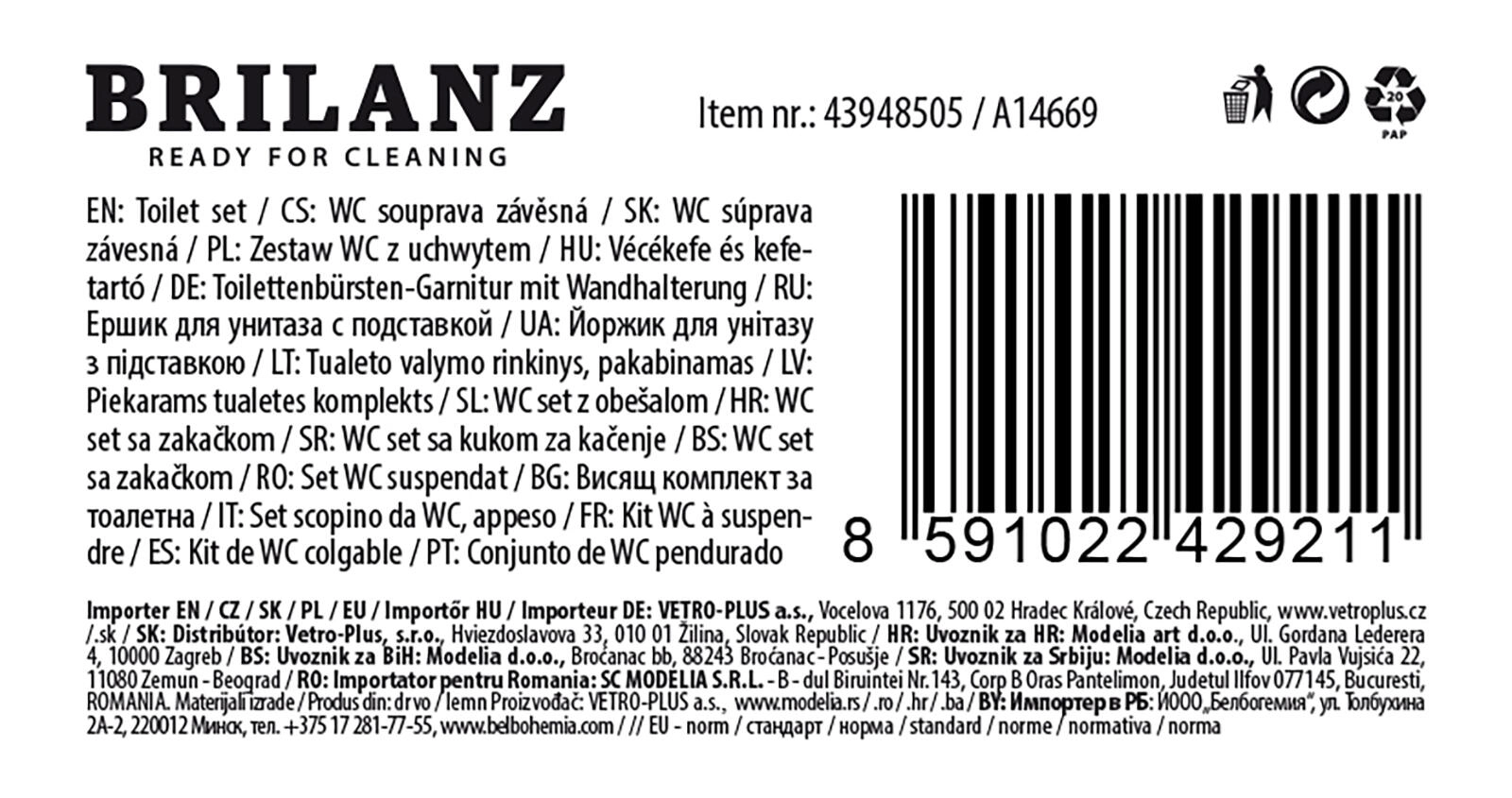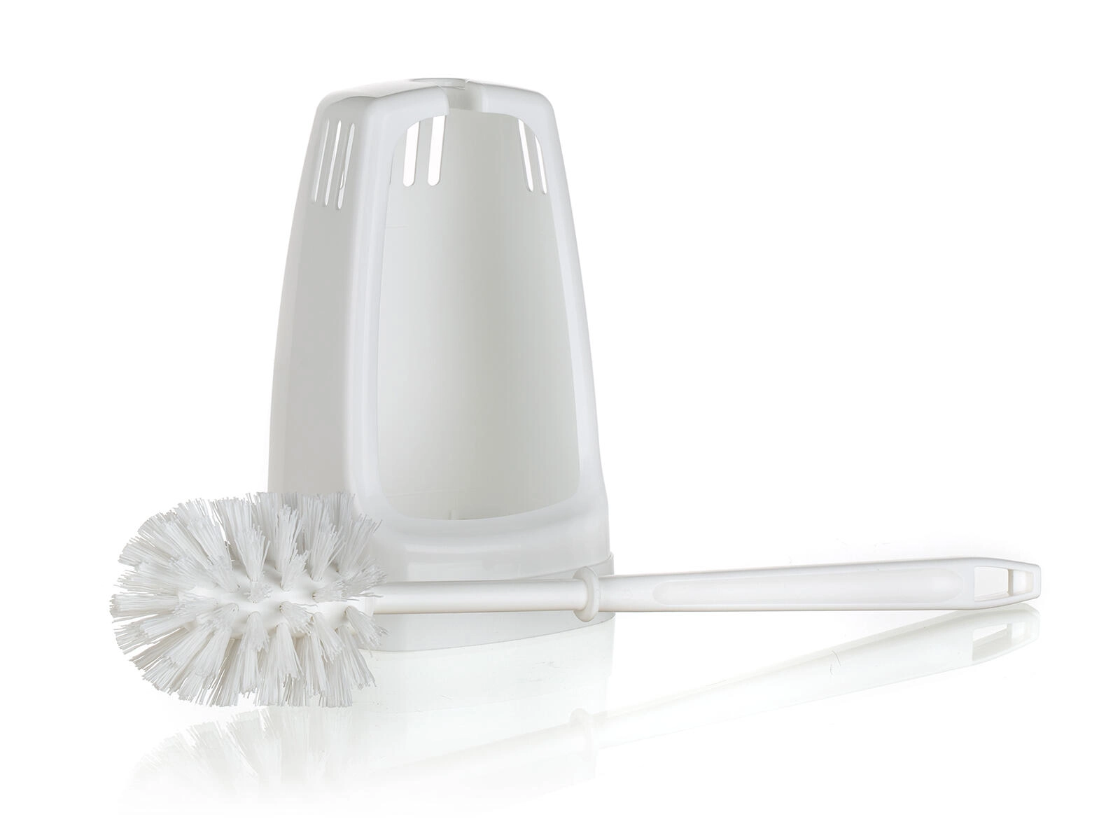 Praktische WC-set met een vierkante houder voor de dagelijkse hygiëne van het toilet. Biedt compacte afmetingen, duurzaam kunststof materiaal en een borstel met een diameter van 7 cm met synthetische vezels voor effectief reinigen. Inclusief een stop op het handvat die de borstel stevig in de houder houdt.