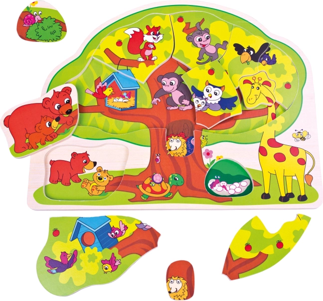 Ontdek de vrolijke houten inlegpuzzel in de vorm van een boom met 11 dierenstukjes, die het logisch denken, de verbeelding en de fijne motoriek van kinderen stimuleert. Stevige multiplex en duurzame afwerking zorgen voor een lange levensduur en veilig spelen vanaf 12 maanden.