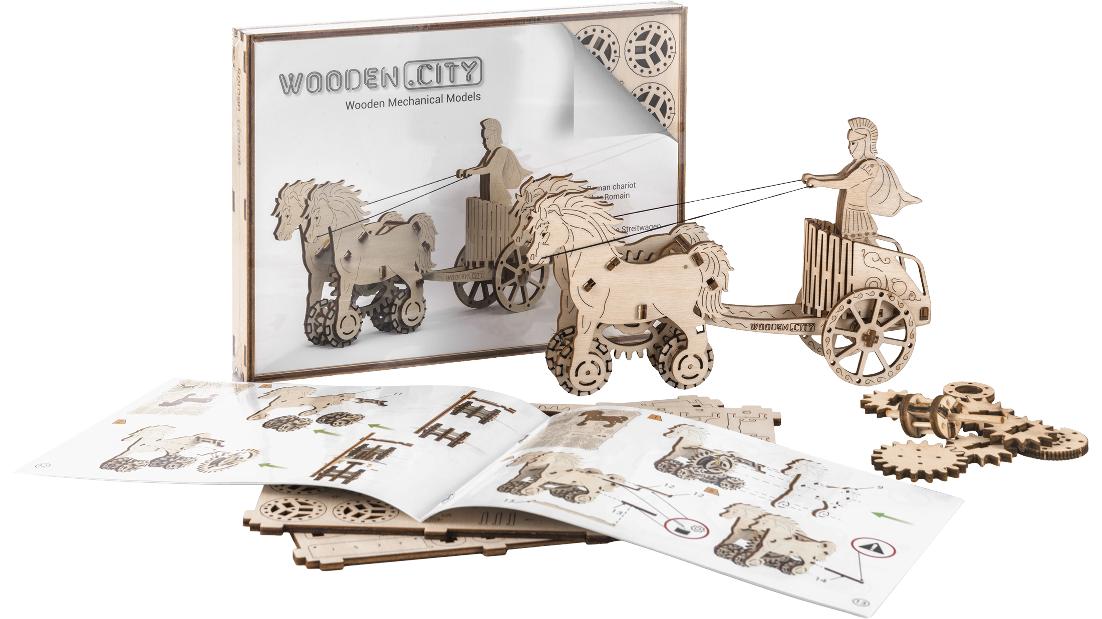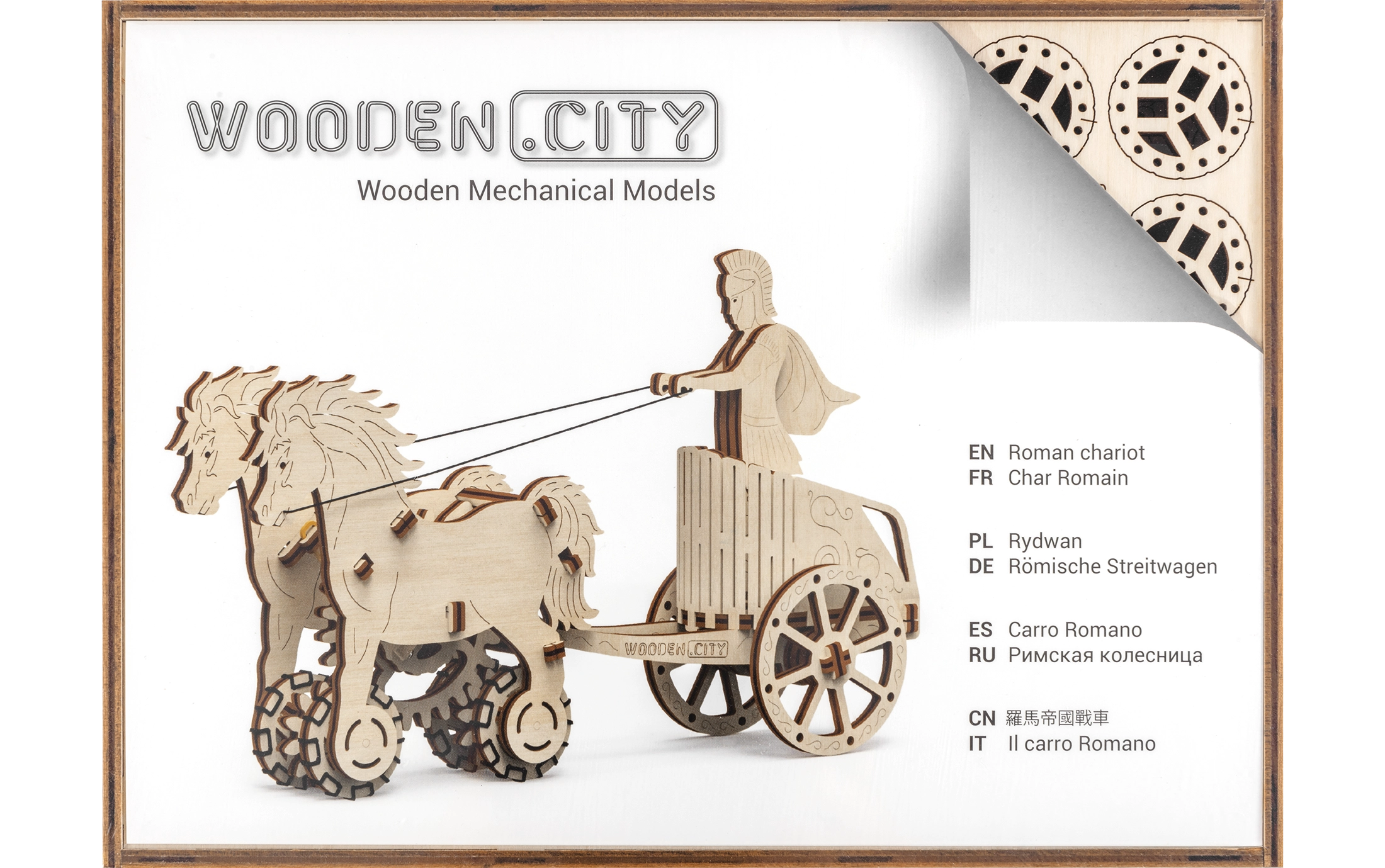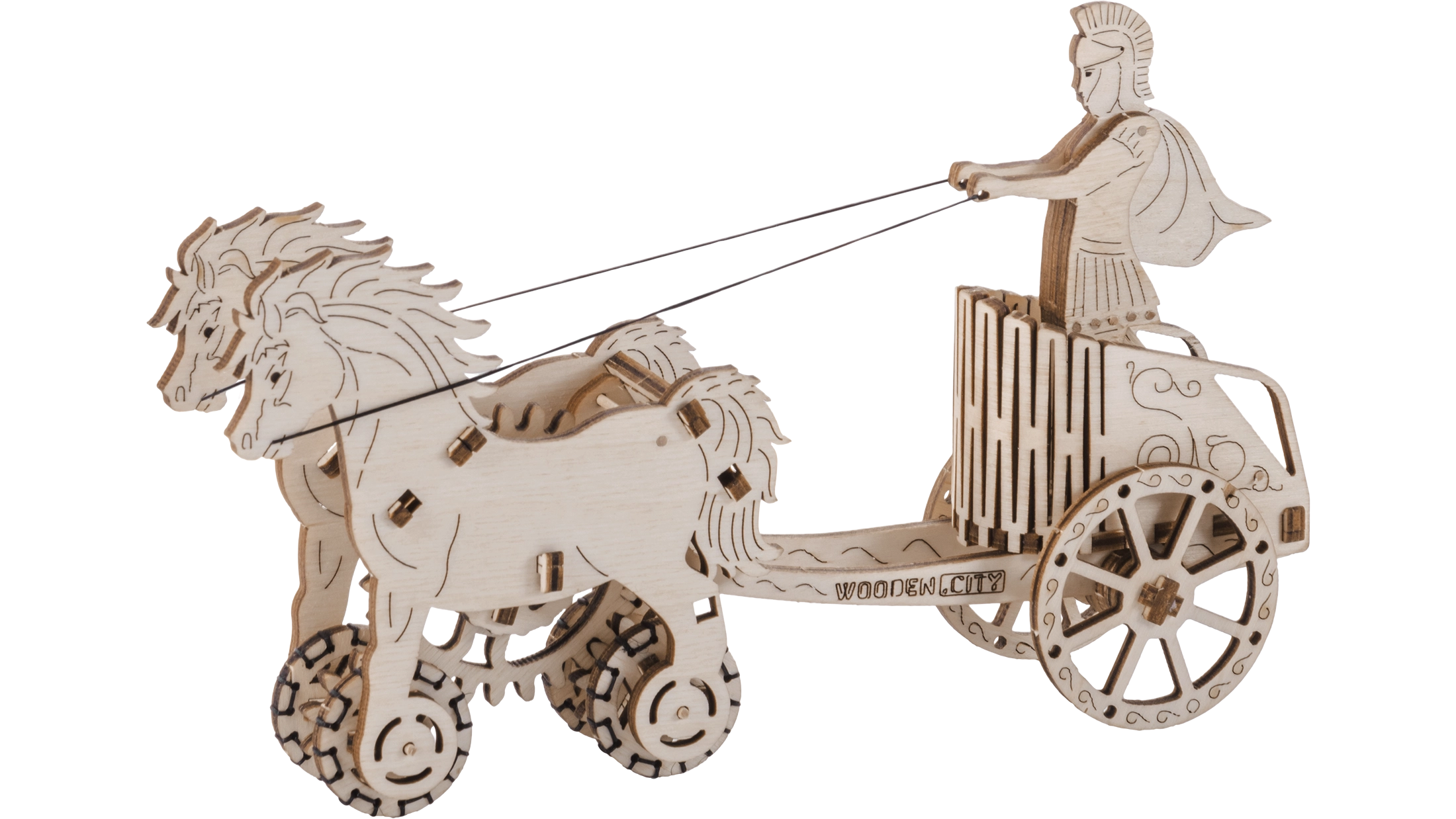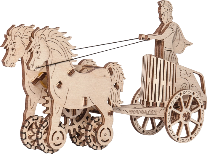 In naam van het rijk. Bouwpakket van een Romeinse wagen met tweespan, gemaakt van multiplex. In de natuurgetrouw weergegeven wagen bevindt zich een gedetailleerd uitgevoerde figuur van een Romeinse ruiter. Dankzij het opwindmechanisme kan het model rijden; bij de start kan het het steigeren van het trekspan nabootsen en legt het tot 1 meter af. Organiseer races met andere Wooden City modellen! Voorzien van een gedetailleerde montagehandleiding. Belangrijkste kenmerken: 74 nauwkeurig uitgesneden onderdelen, lage moeilijkheidsgraad van montage, het eindmodel kan zelfstandig rijden