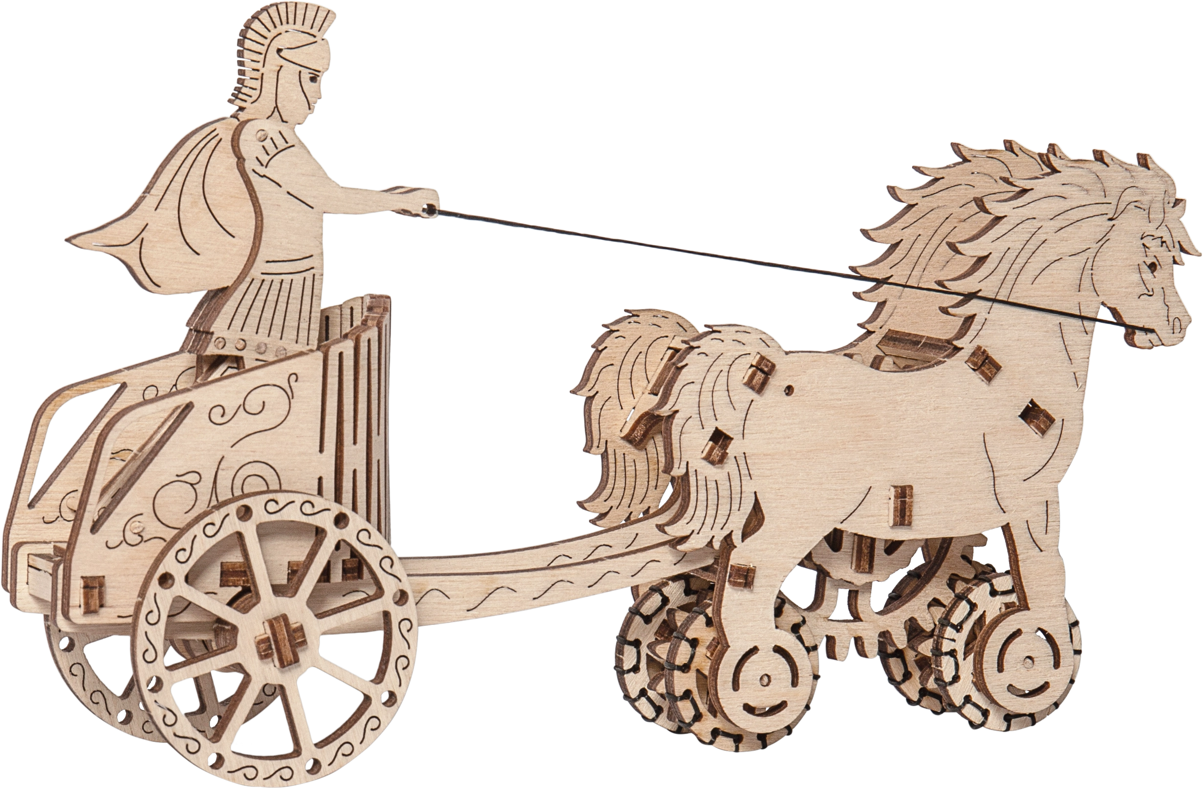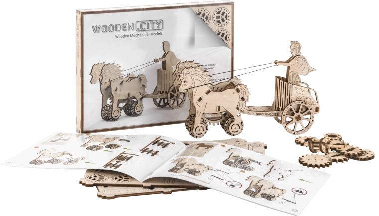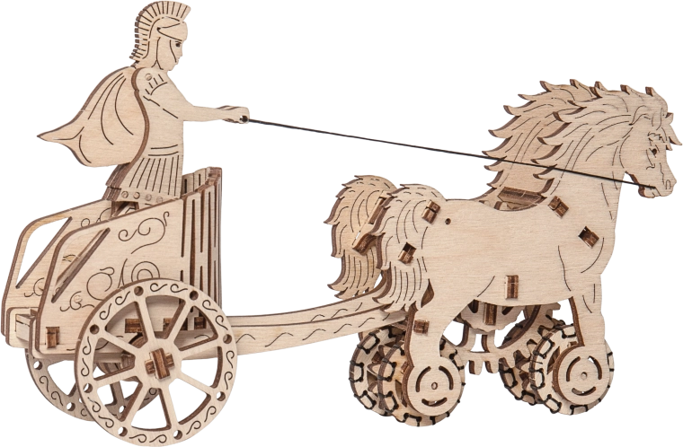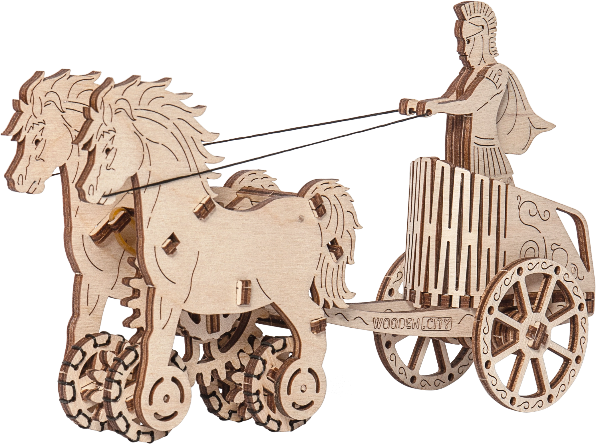 In naam van het rijk. Bouwpakket van een Romeinse wagen met tweespan, gemaakt van multiplex. In de natuurgetrouw weergegeven wagen bevindt zich een gedetailleerd uitgevoerde figuur van een Romeinse ruiter. Dankzij het opwindmechanisme kan het model rijden; bij de start kan het het steigeren van het trekspan nabootsen en legt het tot 1 meter af. Organiseer races met andere Wooden City modellen! Voorzien van een gedetailleerde montagehandleiding. Belangrijkste kenmerken: 74 nauwkeurig uitgesneden onderdelen, lage moeilijkheidsgraad van montage, het eindmodel kan zelfstandig rijden