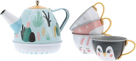 Deze kwalitatieve metalen theeset maakt alle kleine gastheren en gastvrouwen blij. In de theepot zit een verborgen opwindbaar muziekmechanisme dat bij het kantelen een aangename melodie laat horen en van elk theemoment een klein ceremonieel maakt. Pasteltinten, lieve dierenmotieven en pure vormen maken van de set een prachtig cadeau en een stijlvol accent in de kinderkamer.