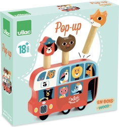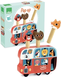 Vilac Houten uitwerpbaar spel Bus met dieren is een prachtig speeltje met illustraties van de bekende kunstenares Ingela P. Arrhenius. Drie schattige figuurtjes - vos, hond en kat - springen uit de bus, wat kinderen zeker zal vermaken.