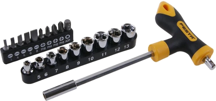 Praktische 20-delige T-handgreep schroevendraaierset van FESTA voor snel en comfortabel schroeven. Bevat een brede selectie bits en doppen met 1/4" opname, vervaardigd uit duurzame CrV-staal. Voor precies werk en eenvoudige hantering is er een magnetische tip beschikbaar.