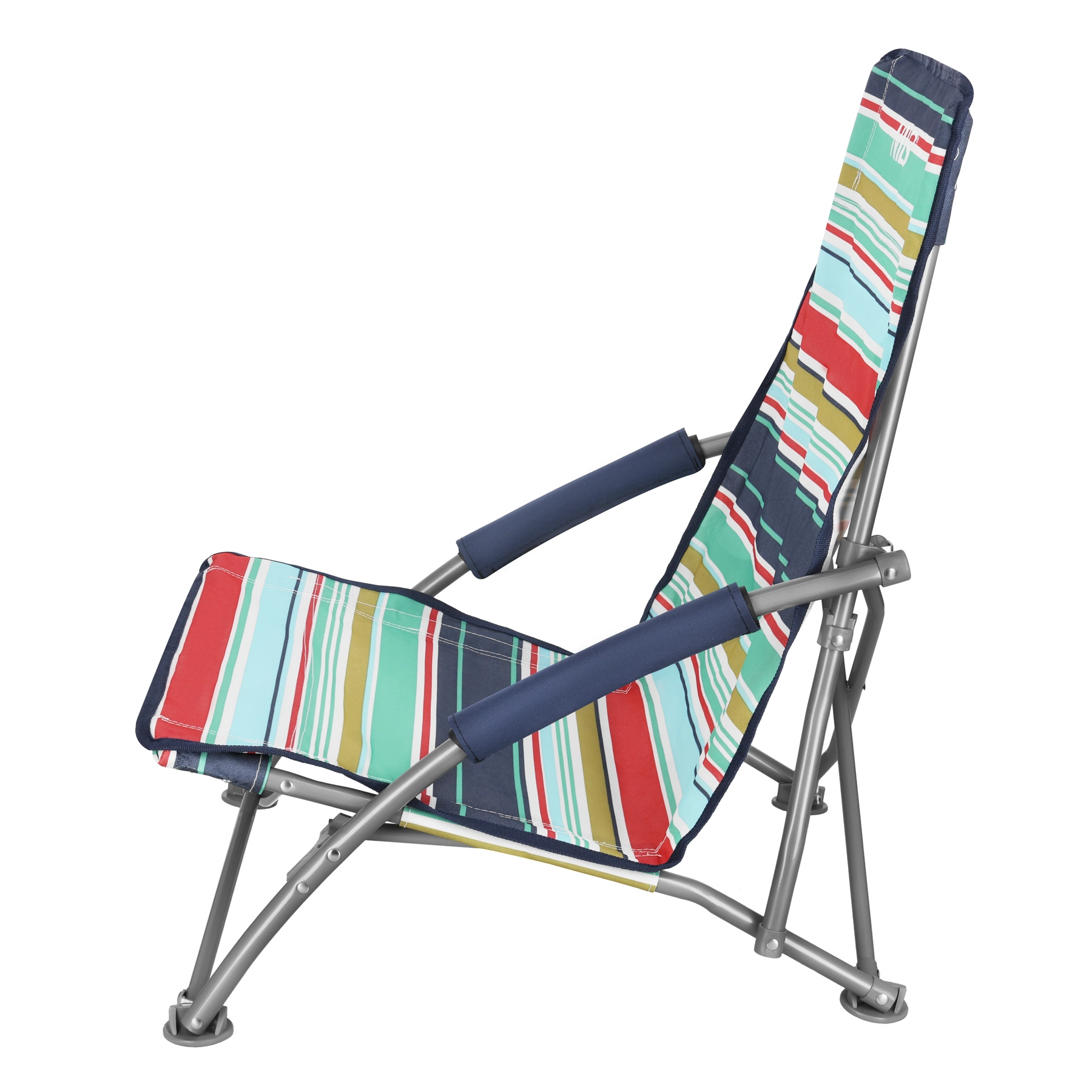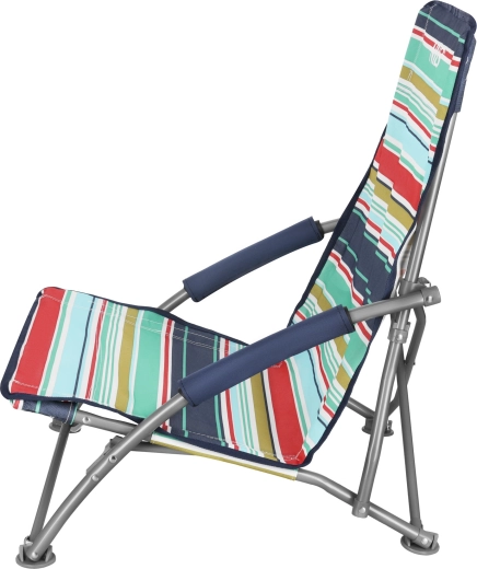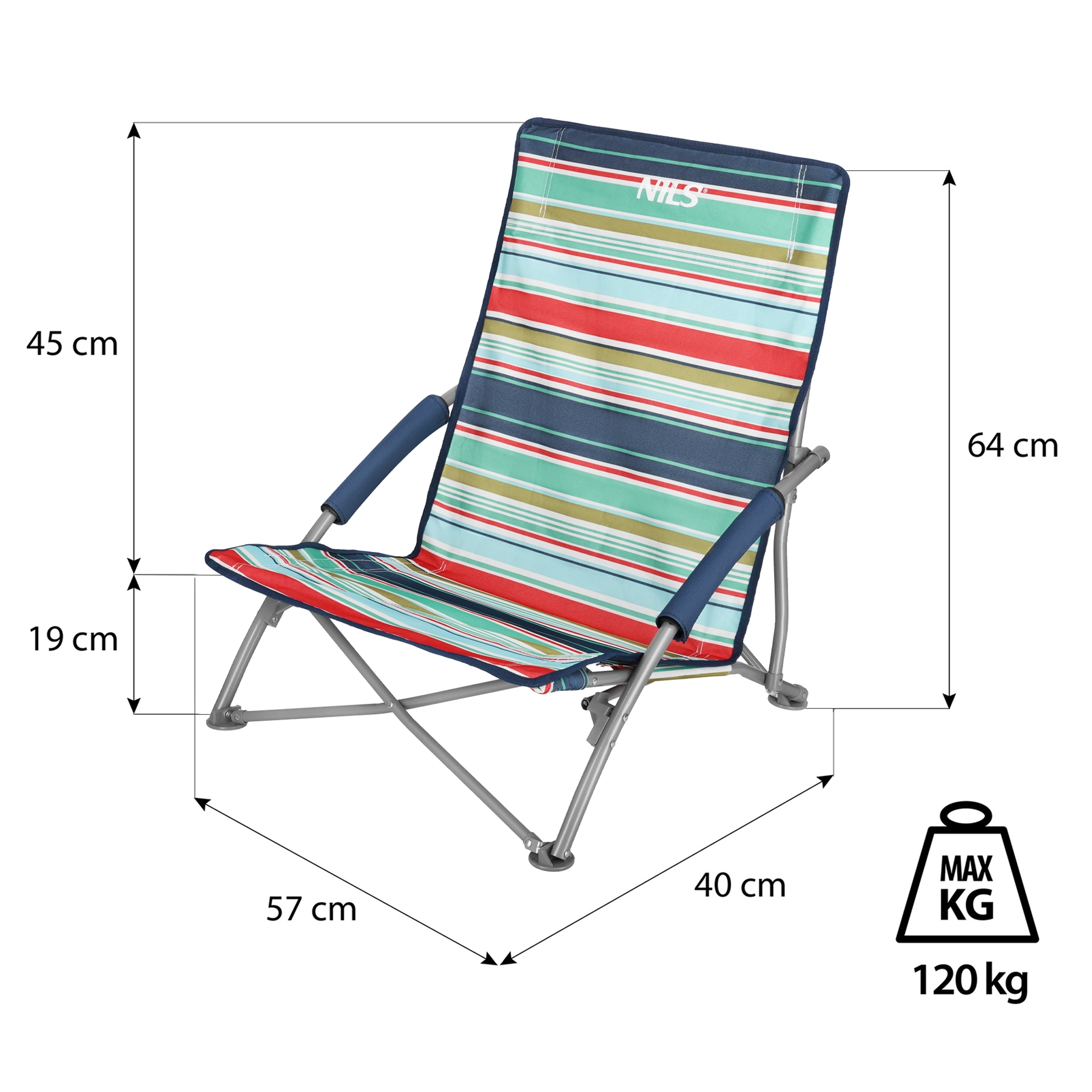 Voor maximaal comfort heeft de stoel foam armleuningen en een lage zit, ideaal voor op het strand. Ronde kunststof voetjes verhogen de stabiliteit, voorkomen wegglijden en zakken niet weg in zachte ondergrond zoals zand. Ingeklapt past de stoel in de meegeleverde transportzak, wat handig is voor zowel reizen als opbergen.