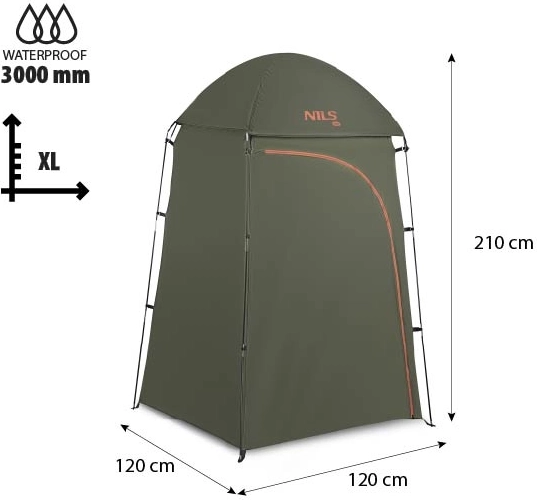 Geniet van volledig comfort en privacy buitenshuis. De NILS Camp cabine is ideaal als mobiele kleedruimte, douchecabine of toilettent. De hoogte van 210 cm en het grondvlak van 120 × 120 cm bieden voldoende ruimte voor comfortabele beweging en het ophangen van een doucheslang.