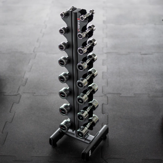 De torenconstructie maakt het mogelijk tot 8 paar dumbbells op een minimale oppervlakte op te bergen en de trainingszone overzichtelijk te houden.