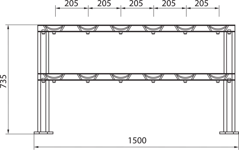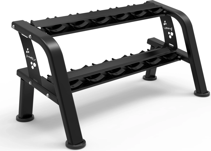 De HMS STR48 is een doordacht ontworpen tweelaagse standaard die veilige opslag van maximaal 12 halters garandeert. Dankzij de licht hellende leggers is de omgang met halters comfortabeler en worden de polsen ontzien. De zware stalen constructie en brede basis staan garant voor hoge stabiliteit, zelfs bij volledige belasting.