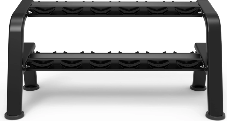 Twee brede, licht hellende leggers bieden snelle en veilige toegang tot zes paar halters en besparen ruimte in je gym.