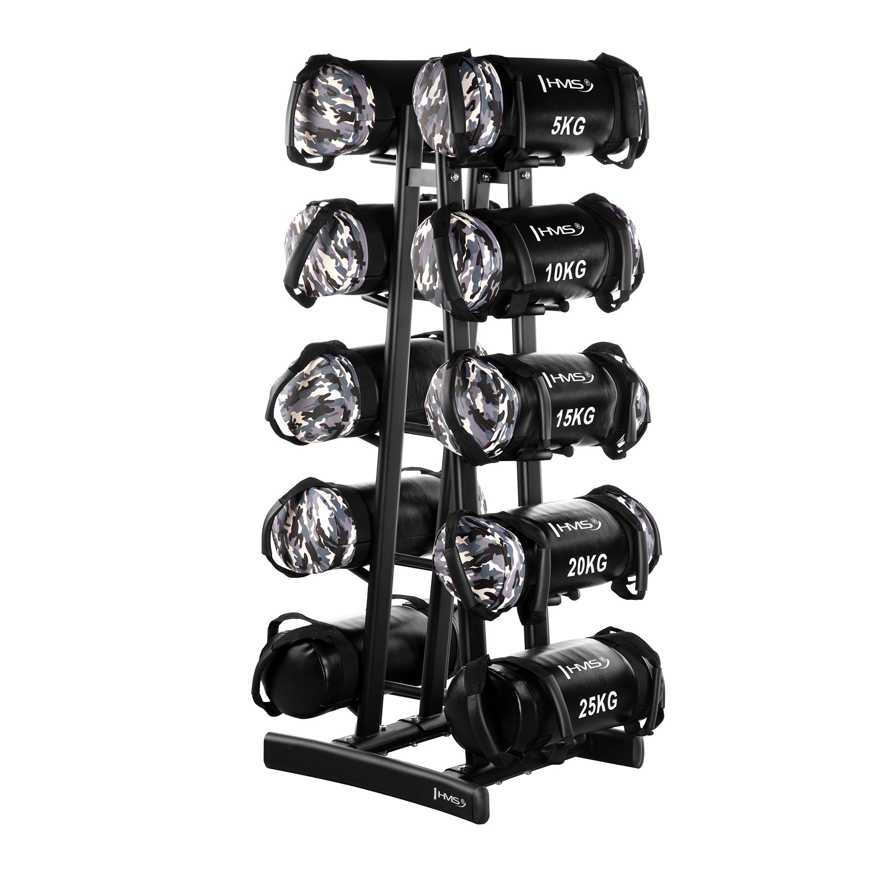 De slimme armconstructie biedt plaats aan medicineballen, slam balls en HMS-trainingszakken met verschillende gewichten, zodat je alles binnen handbereik hebt op één plek.