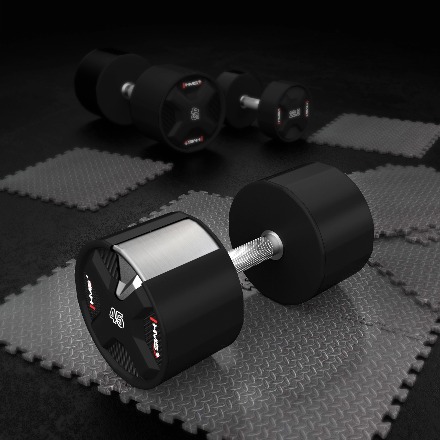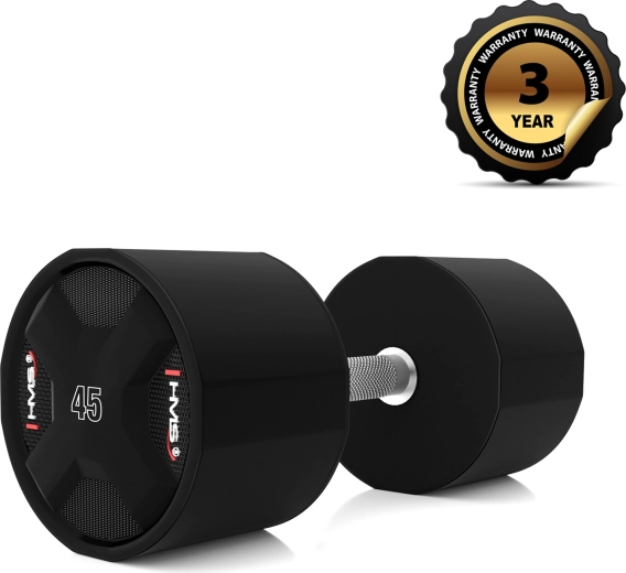 De HMS polyurethaan dumbbell 45 kg combineert een robuuste stalen kern met gegoten polyurethaan (CPU) voor maximale levensduur, vormvastheid en minimaal onderhoud. De verchroomde, geknurlde handgreep garandeert een stevige greep, zelfs bij de zwaarste sets, zodat je je kunt focussen op prestatie en techniek.
