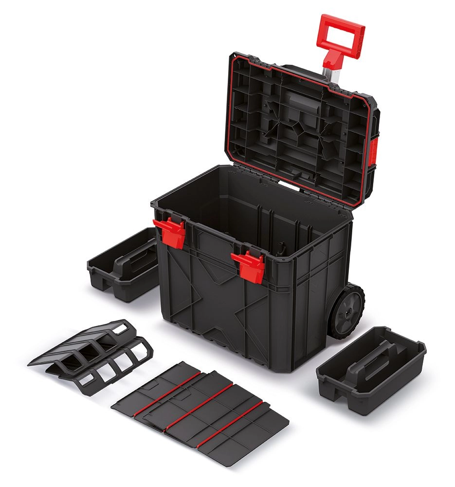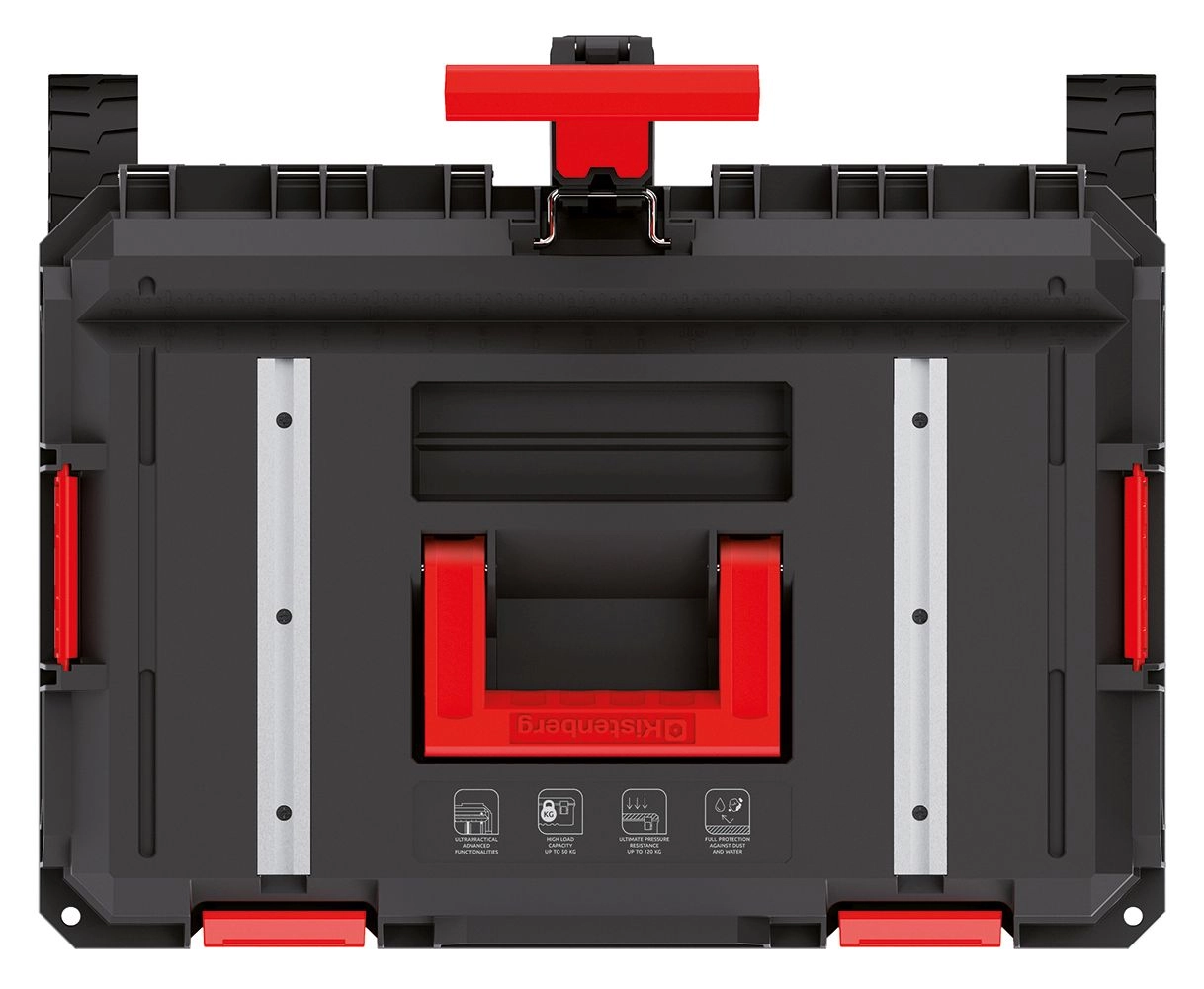 De verrijdbare X-Block Tech-box combineert een sterke constructie, slimme organisatie en eenvoudig transport. Geribde wanden, verstevigde hoeken en hoogwaardige sluitingen beschermen de inhoud, zelfs in stoffige of vochtige omgevingen. Dankzij de telescopische handgreep en de grote, duurzame wielen verplaatst u uw gereedschap veilig door de werkplaats en op de bouw.