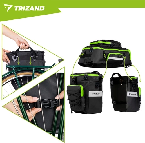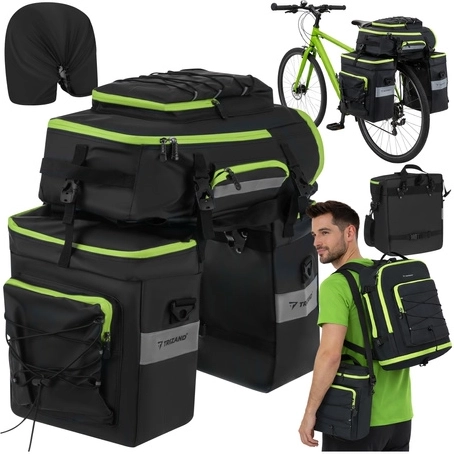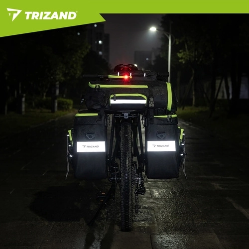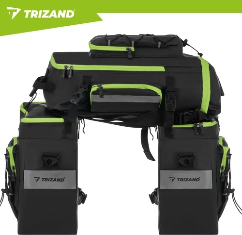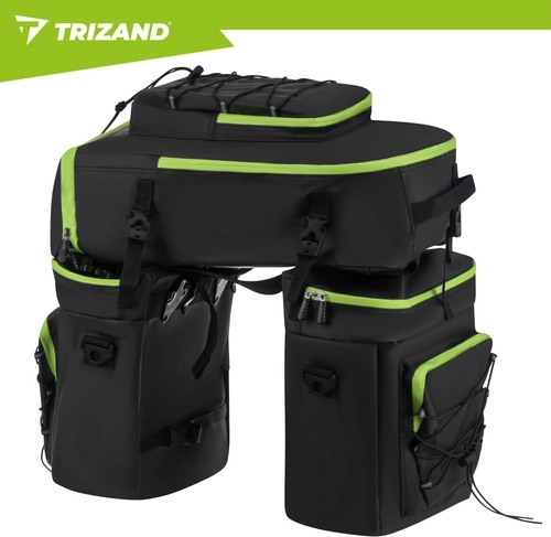 Praktische TRIZAND 3-in-1 fietstas met een inhoud van 65 l combineert twee zijtassen en een boventas/rugzak voor maximale flexibiliteit tijdens tochten, woon-werkverkeer en bikepacking. Duurzame waterdichte materialen, zekere bevestiging op de achterdrager, reflecterende elementen en een regenhoes beschermen je spullen bij elk weertype.