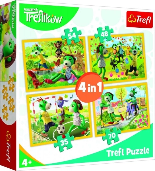 Verras kinderen met een kleurrijke set van 4 onafhankelijke puzzels met motieven uit de populaire serie Familie Treflics. Elke afbeelding heeft een verschillend aantal stukjes, zodat zowel beginners als licht gevorderde puzzelaars aan hun trekken komen. Dankzij speciaal papier dat licht reflecteert zijn de stukjes beter te onderscheiden en is puzzelen aangenamer.