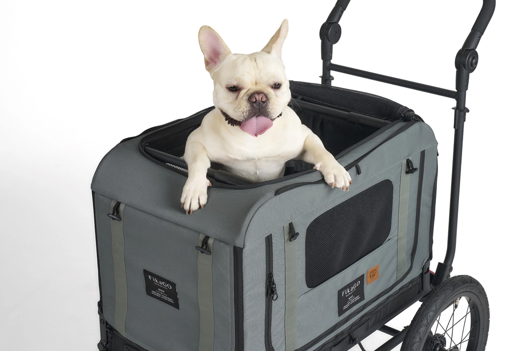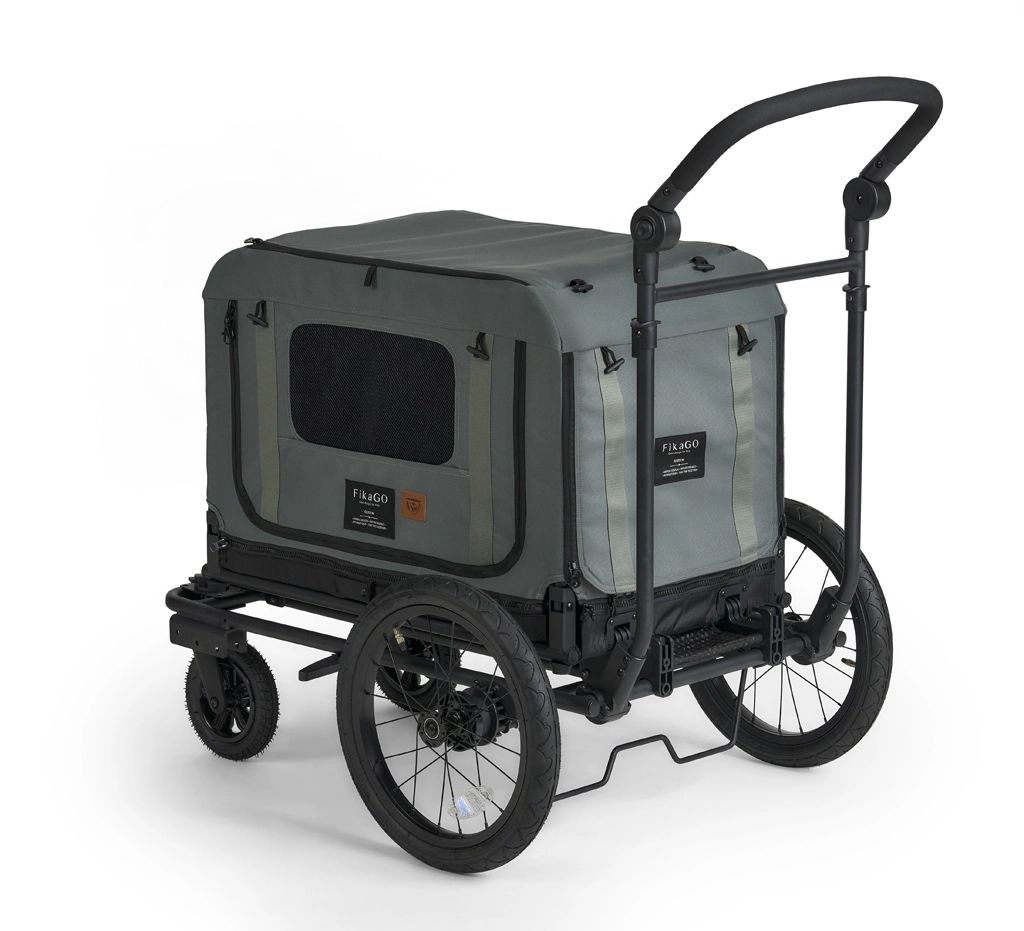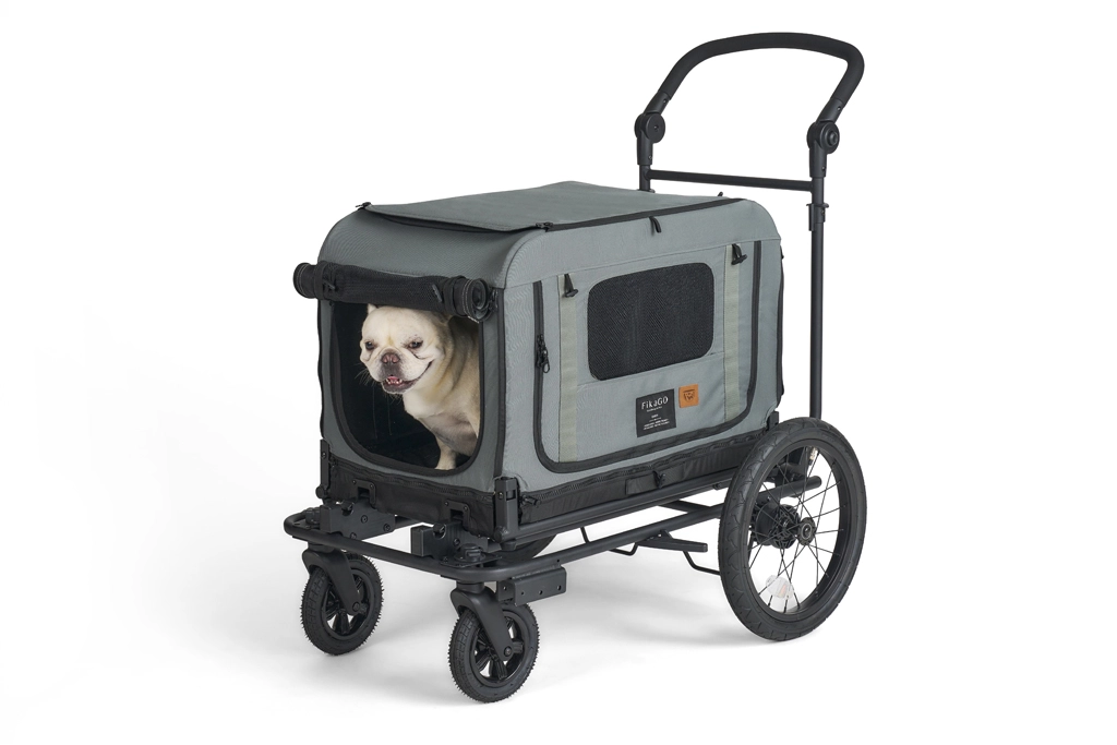 De modulaire hondenwagen Fikago King & Queen S combineert een stevige en veilige ruimte met een soepele rit en hoog draagvermogen. De opvouwbare kennel Queen met een duurzaam aluminium frame biedt rust en comfort voor de hond, terwijl het King-chassis met geveerde wielen en luchtbanden zowel stad als licht terrein aankan. Ideaal voor middelgrote en grote honden, senioren, huisdieren met gevoelige gewrichten of in revalidatie. Kan worden uitgebreid met een fietskoppeling voor langere tochten.