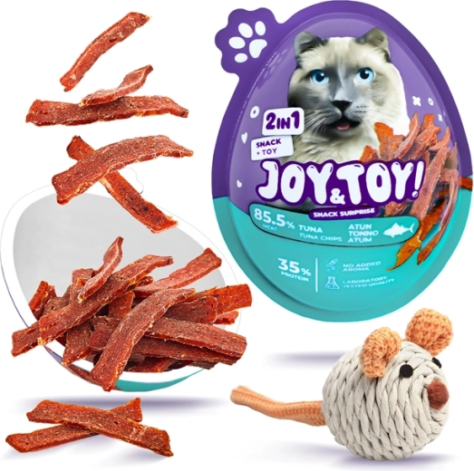 Ontdek plezier en beloning in één: het JOY&TOY! ei combineert heerlijke tonijnstukjes met een verrassingsspeeltje. Elke verpakking bevat een ander model – meer dan 100 mogelijkheden voor plezier en actief spel. De snack wordt voorzichtig gedroogd, zonder kleurstoffen, suiker en smaakversterkers, met een natuurlijke smaak en geur waar katten van houden.