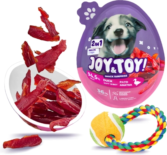 Ontdek plezier en beloning in één: Joy&Toy ei bevat zachte eendenjerky en verrassingsspeelgoed voor je hond. De snack bestaat uit 94,5% eendenborst, zacht gedroogd en zonder kleurstoffen, suiker en smaakversterkers. In elke verpakking zit een ander speelgoedmodel – meer dan 100 mogelijkheden voor actief spel en plezier.