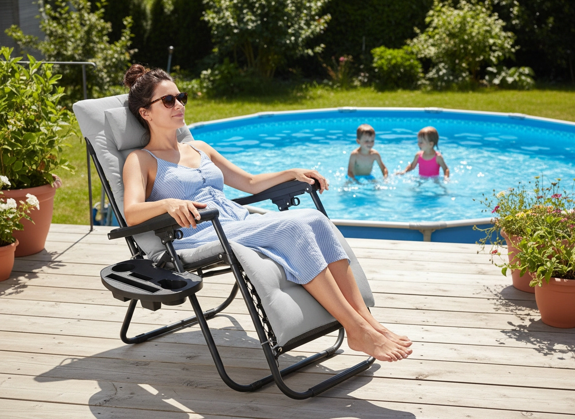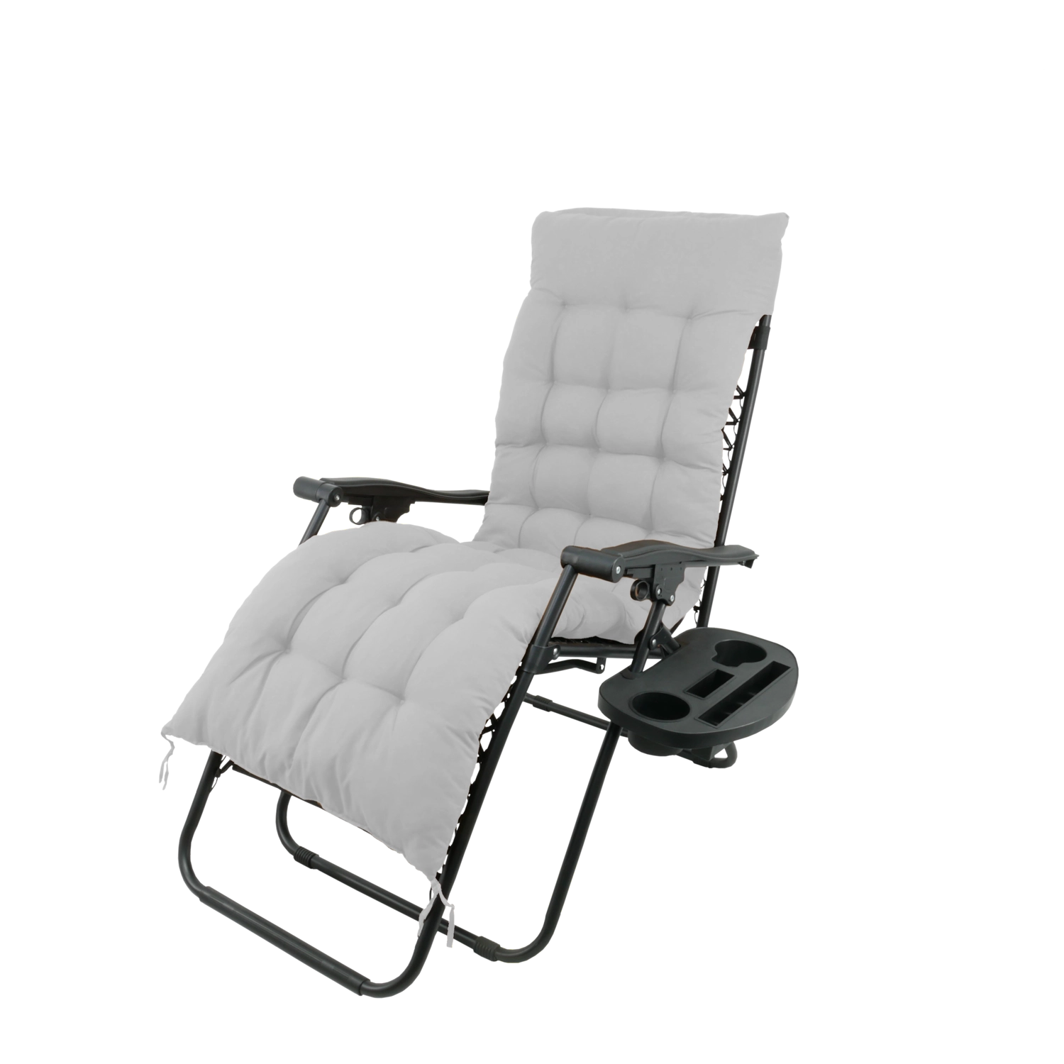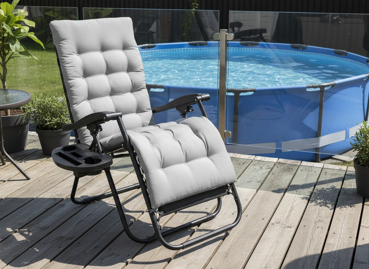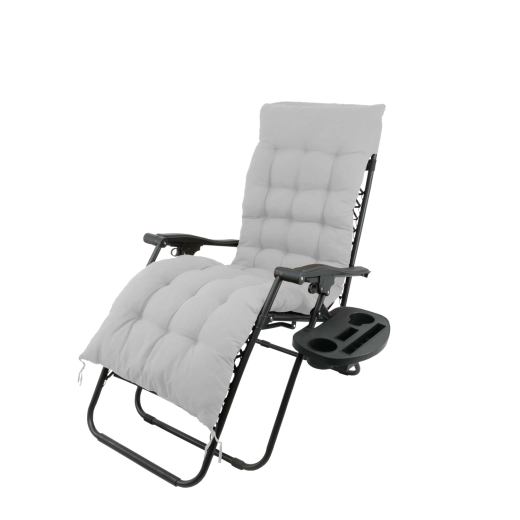 De elegante relaxligstoel combineert een duurzaam stalen frame met ademende 1x2 Textilene-stof en een zacht grijs kussen. Je stelt eenvoudig de optimale ligpositie in en dankzij het opvouwmechanisme is de stoel makkelijk te verplaatsen en op te bergen. Het praktische aflegtafeltje bij de rugleuning biedt plek voor een drankje, telefoon of kleine spullen, zodat je alles bij de hand hebt.