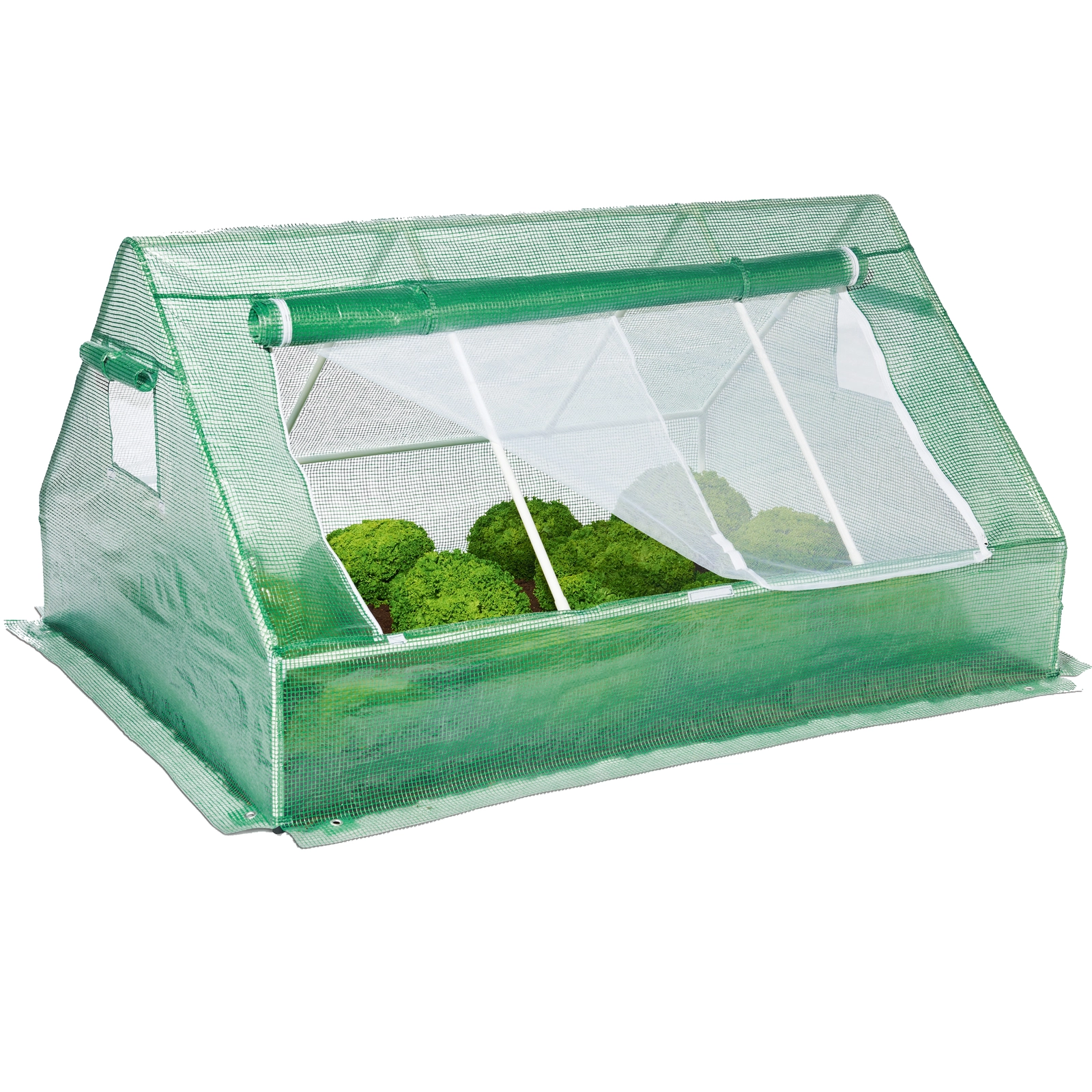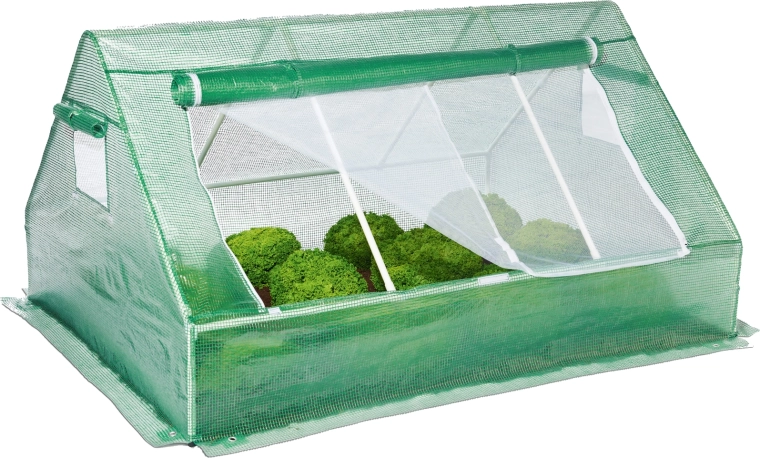 Versterkte PE hoes 130 g/m² met geïntegreerd raster laat licht door, houdt warmte vast en heeft een oprolbaar raam voor het regelen van luchtstroom en vochtigheid.