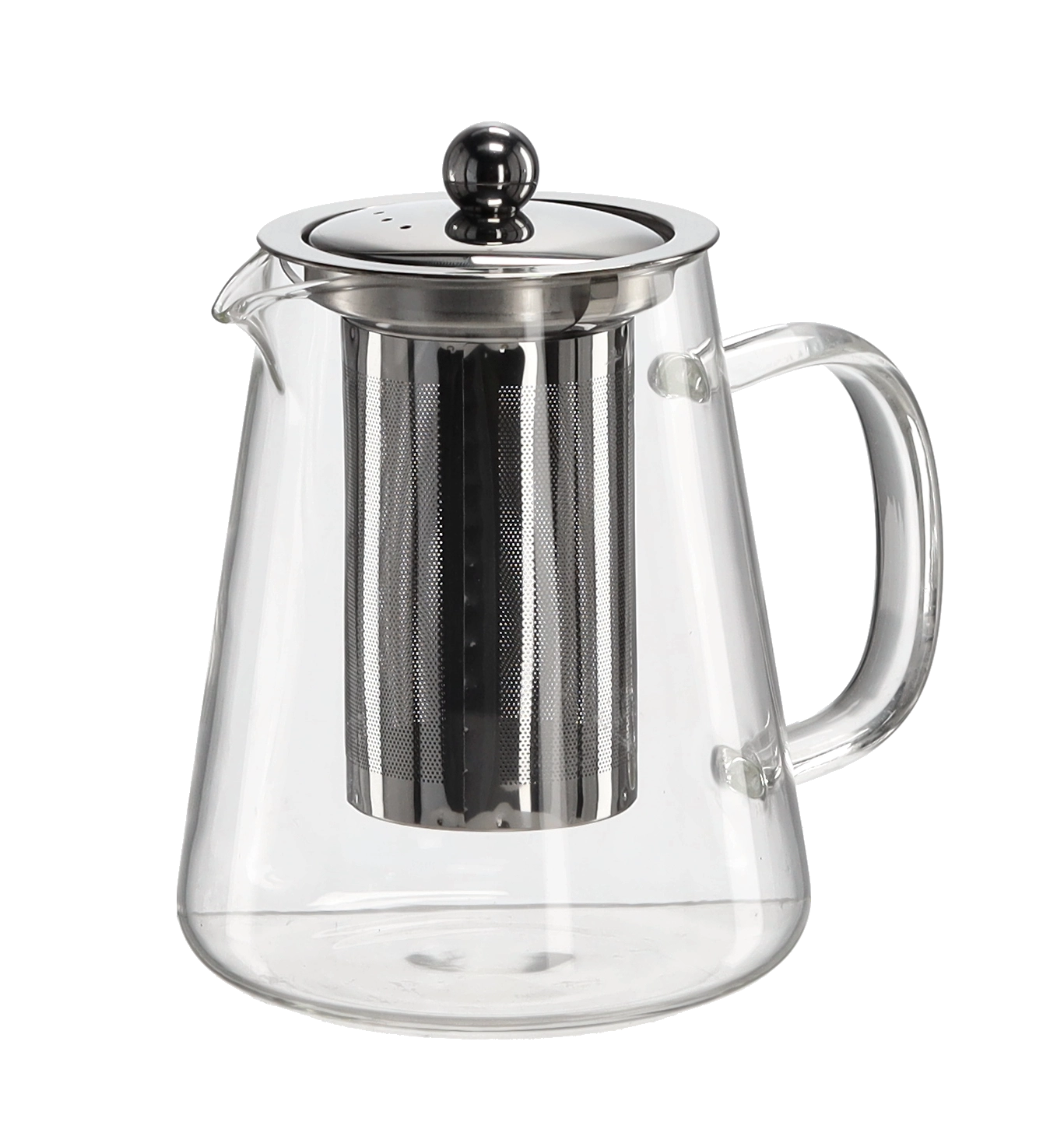 Elegante theekan van 950 ml van hittebestendig glas met een roestvrijstalen filter en een metalen deksel voor een heldere en volle infusie. De transparante uitvoering maakt controle van het trekken mogelijk, terwijl de ergonomische glazen handgreep en stabiele basis zorgen voor veilig en comfortabel gebruik.