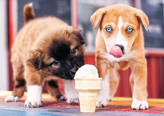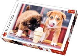 Deze puzzel verrukt je met zijn vorm en het motief van twee speelse puppy's die genieten van een moment met hun ijsjes.