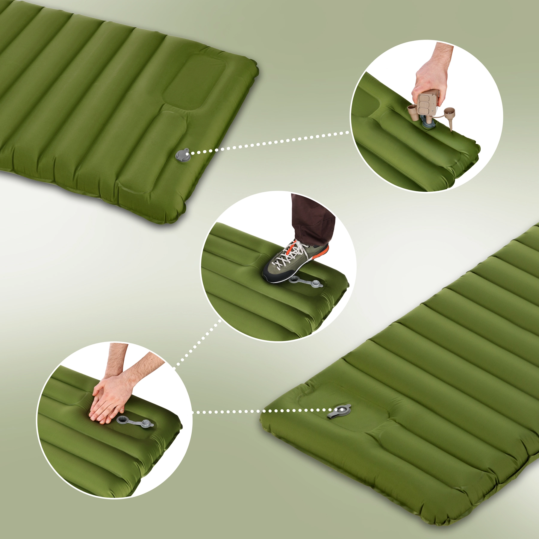 De ingebouwde voet-/handpomp maakt het mogelijk de slaapmat moeiteloos op te blazen, zonder extra uitrusting. Via het ventiel kan ook een externe pomp worden aangesloten.