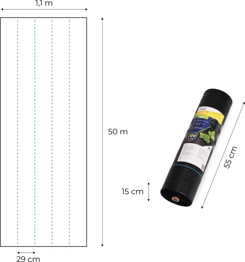 Blauwe hulplijnen om de 29 cm vergemakkelijken rechte rijen en plantafstanden. De rol rolt snel uit en is makkelijk te snijden, de meegeleverde pennen verankeren hem veilig.
