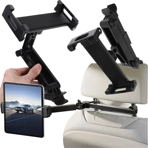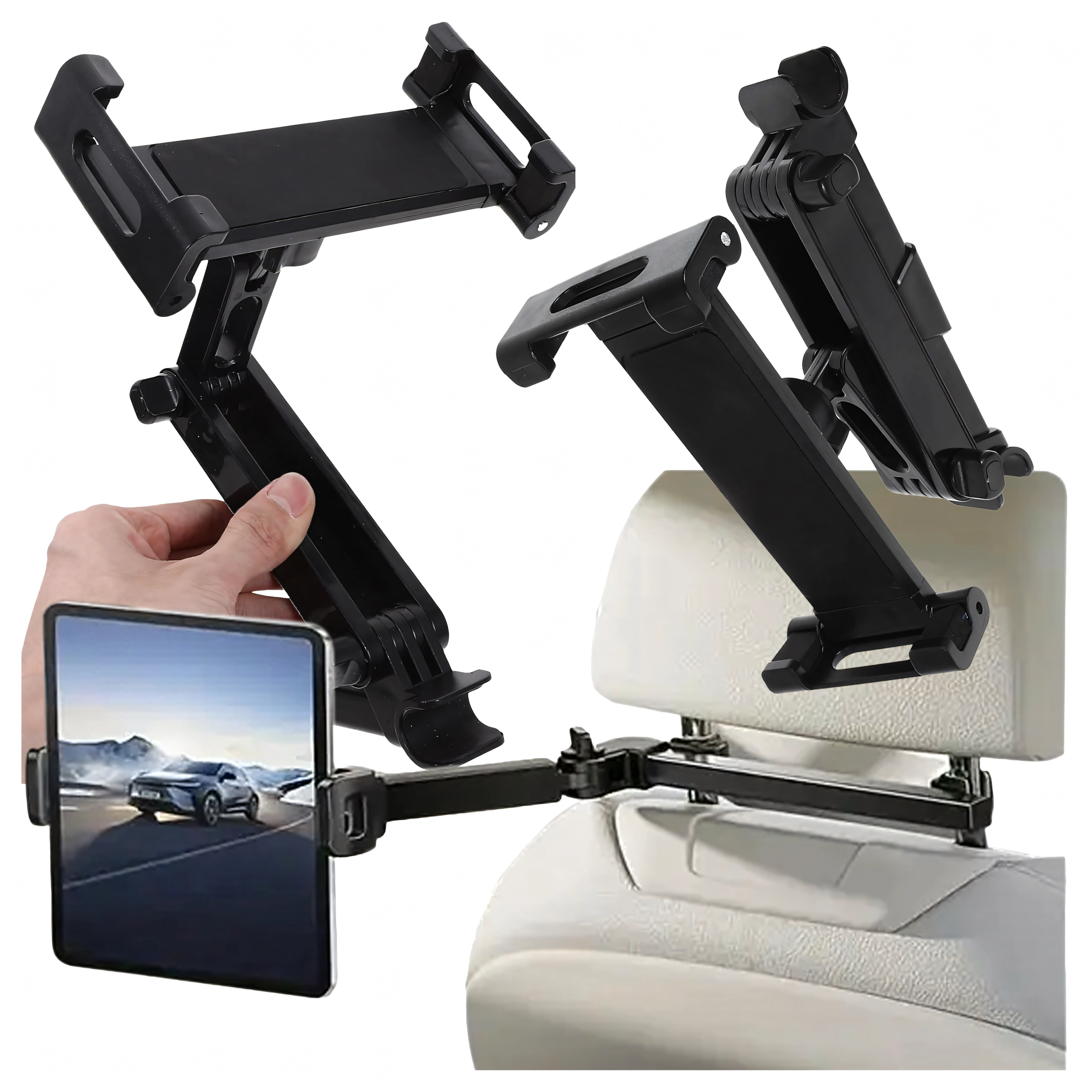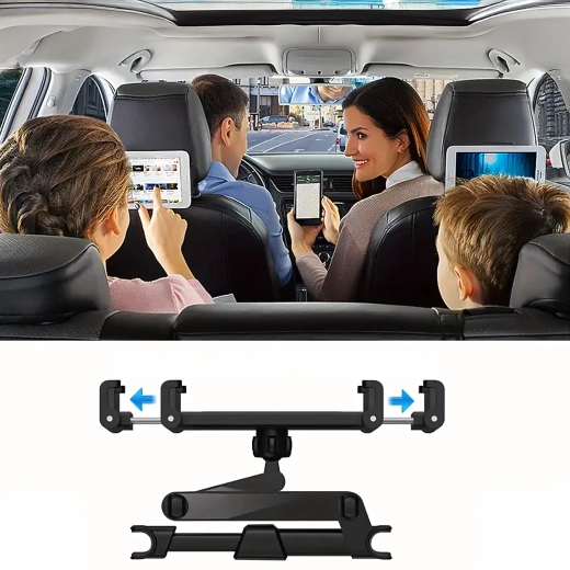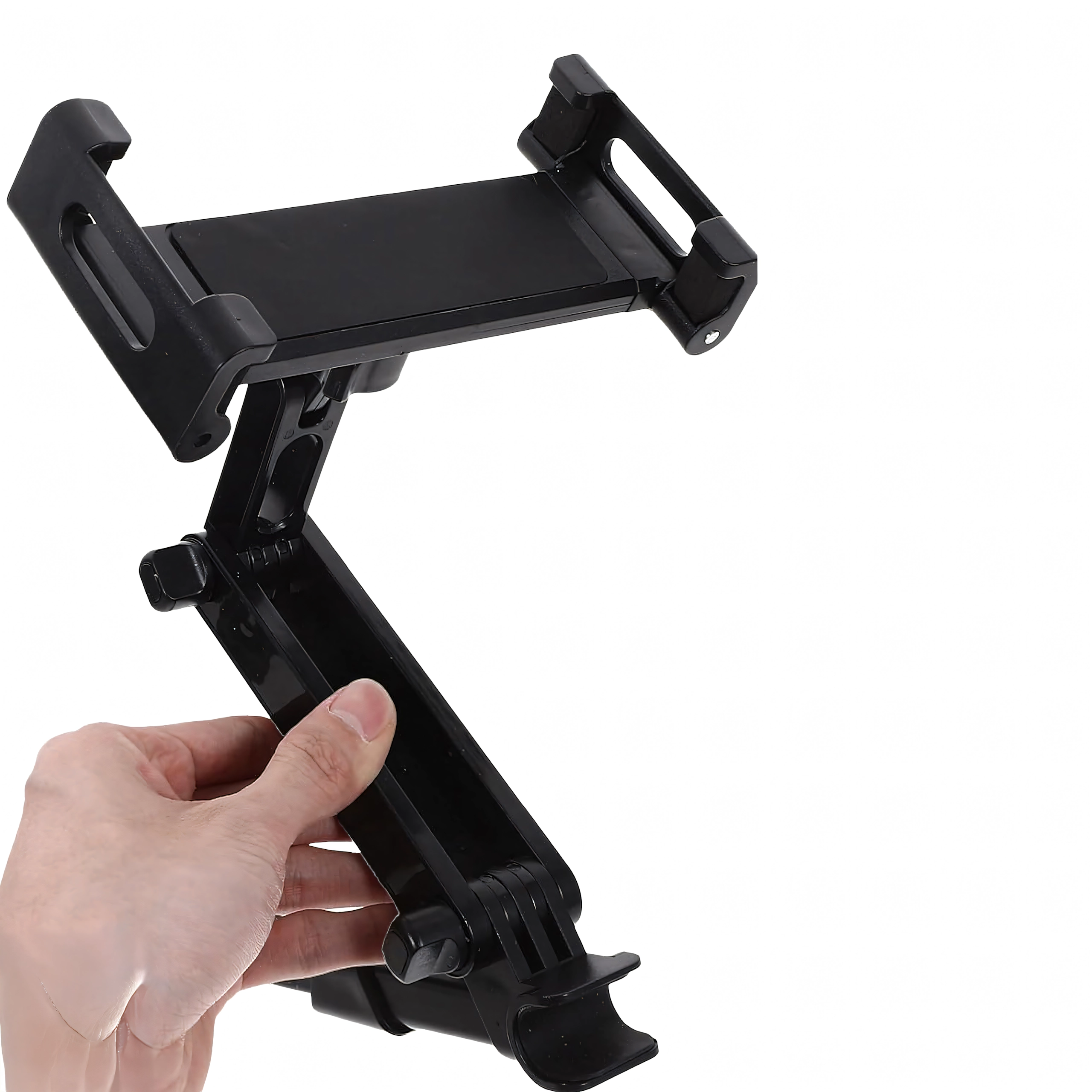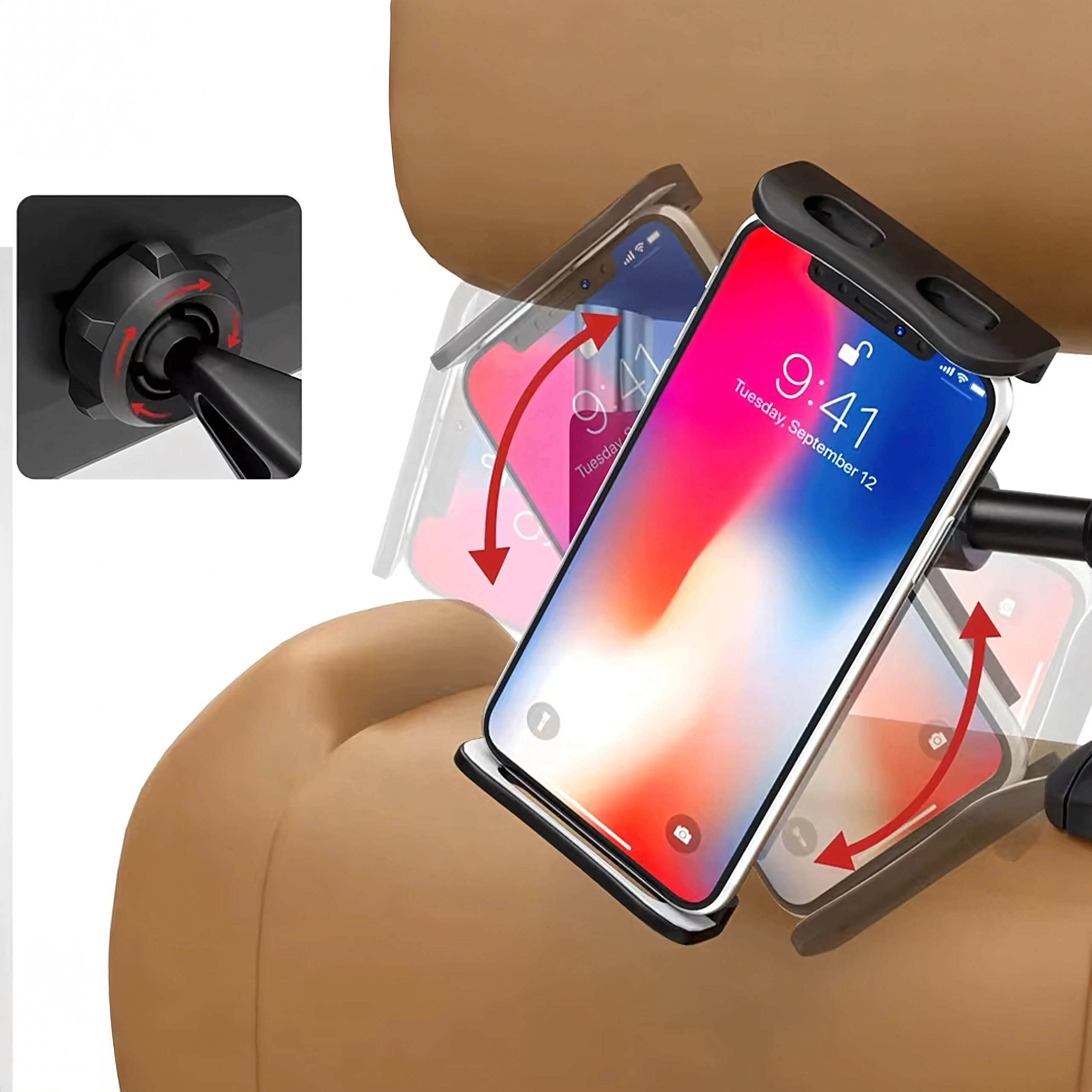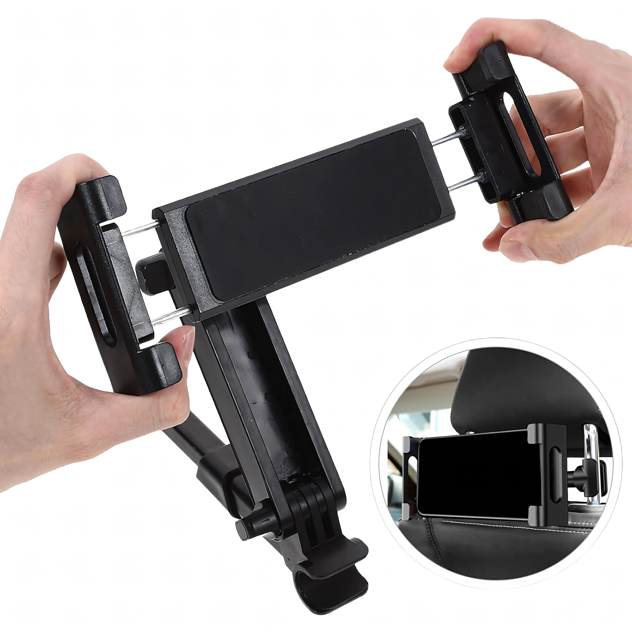 Universele hoofdsteunhouder die de achterbank verandert in een multimediacorner. Dankzij het scharnierontwerp en de kogelkop biedt hij 360° rotatie, brede compatibiliteit met telefoons en tablets en stevige, trillingsvrije bevestiging – ideaal voor films, games en leren onderweg.