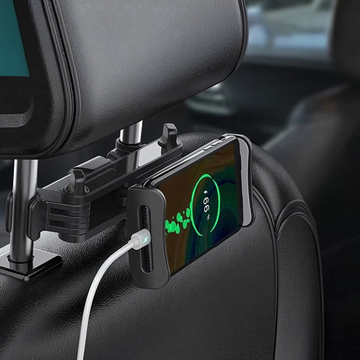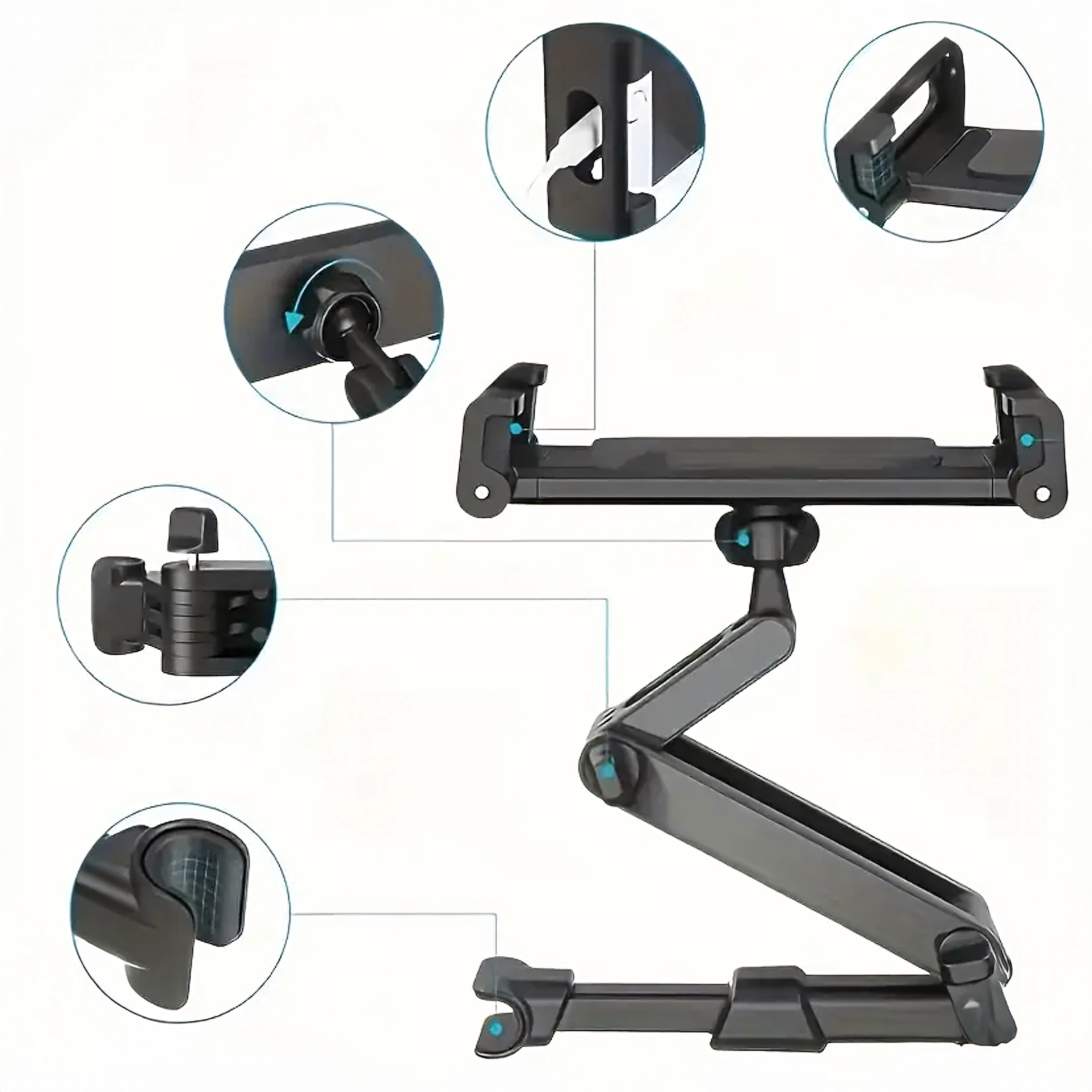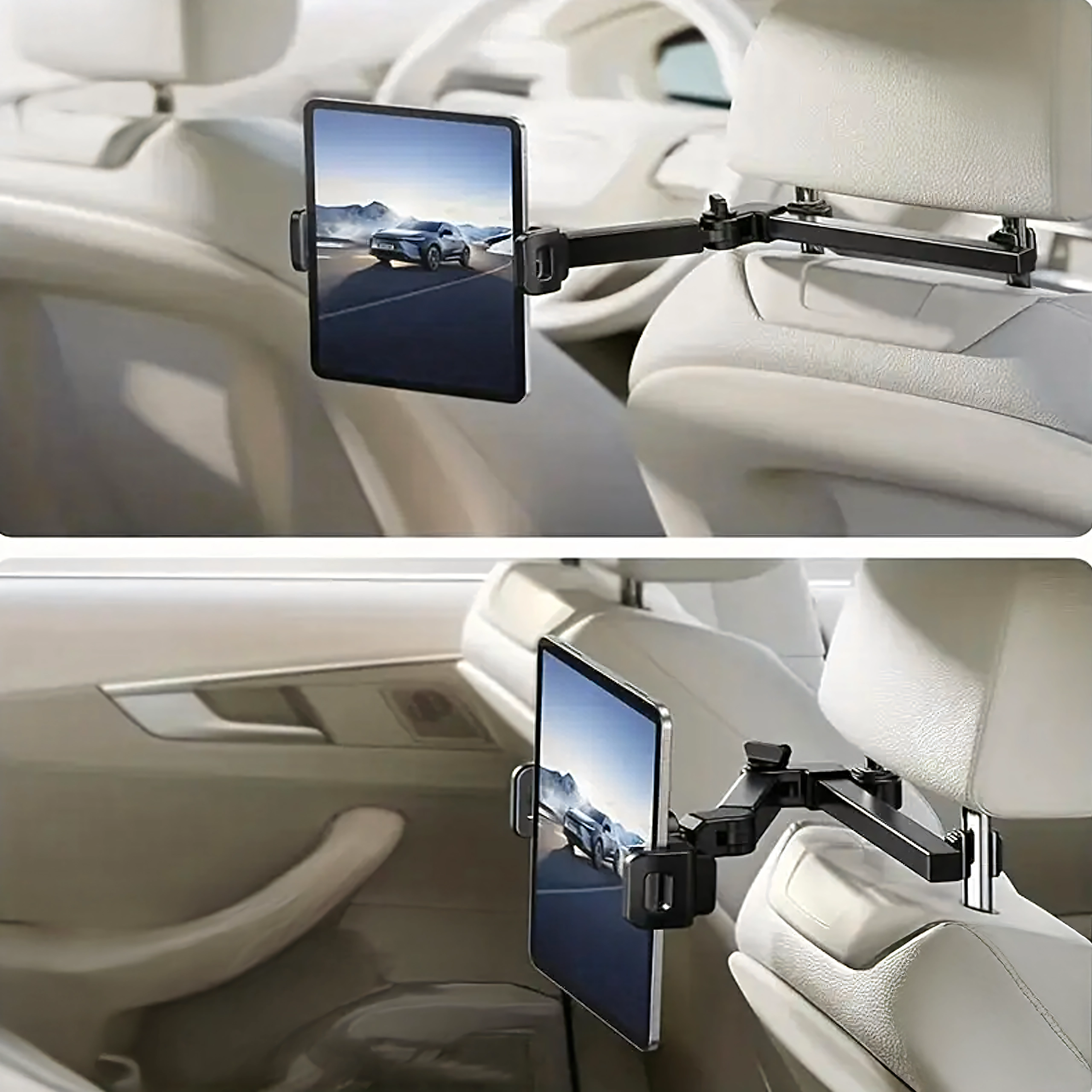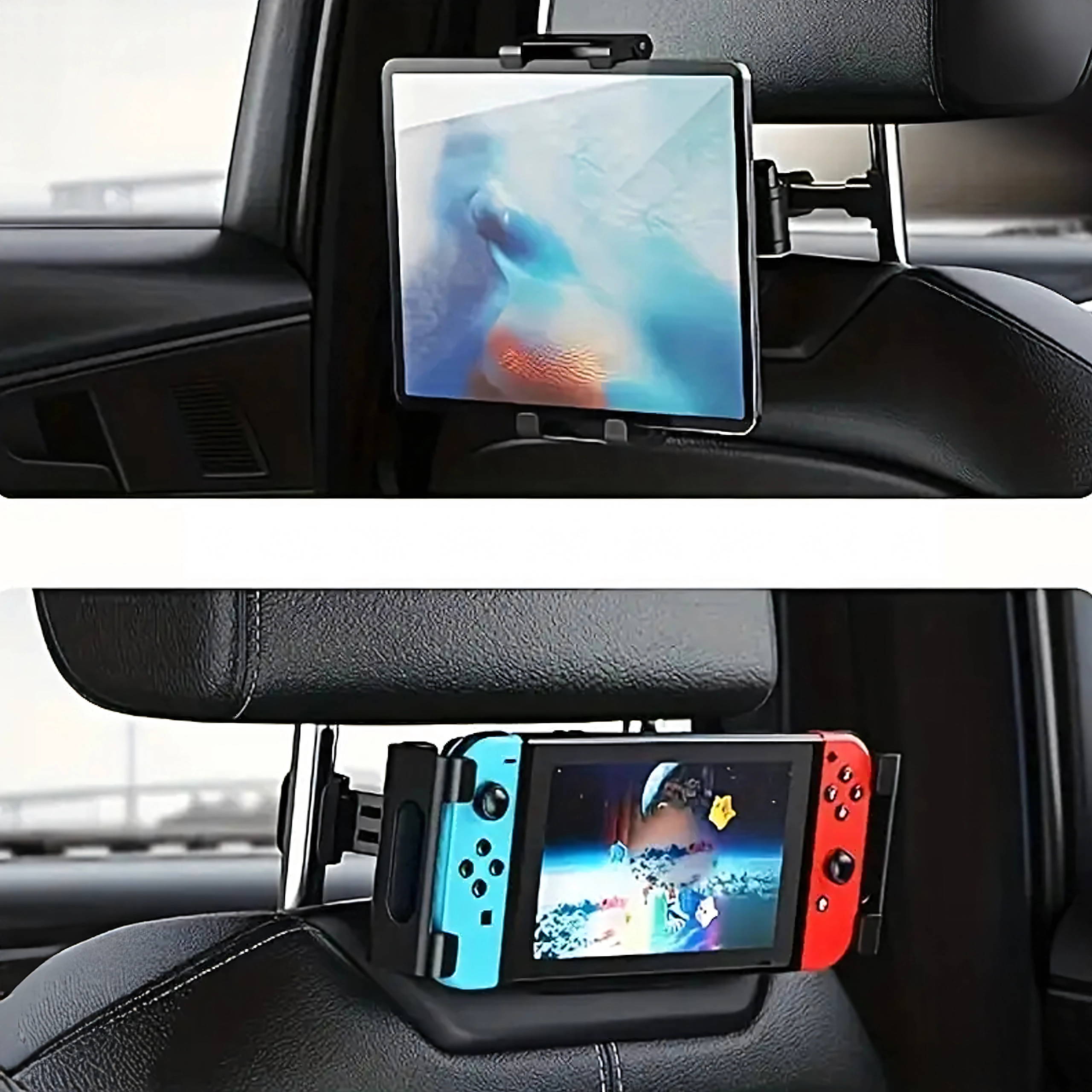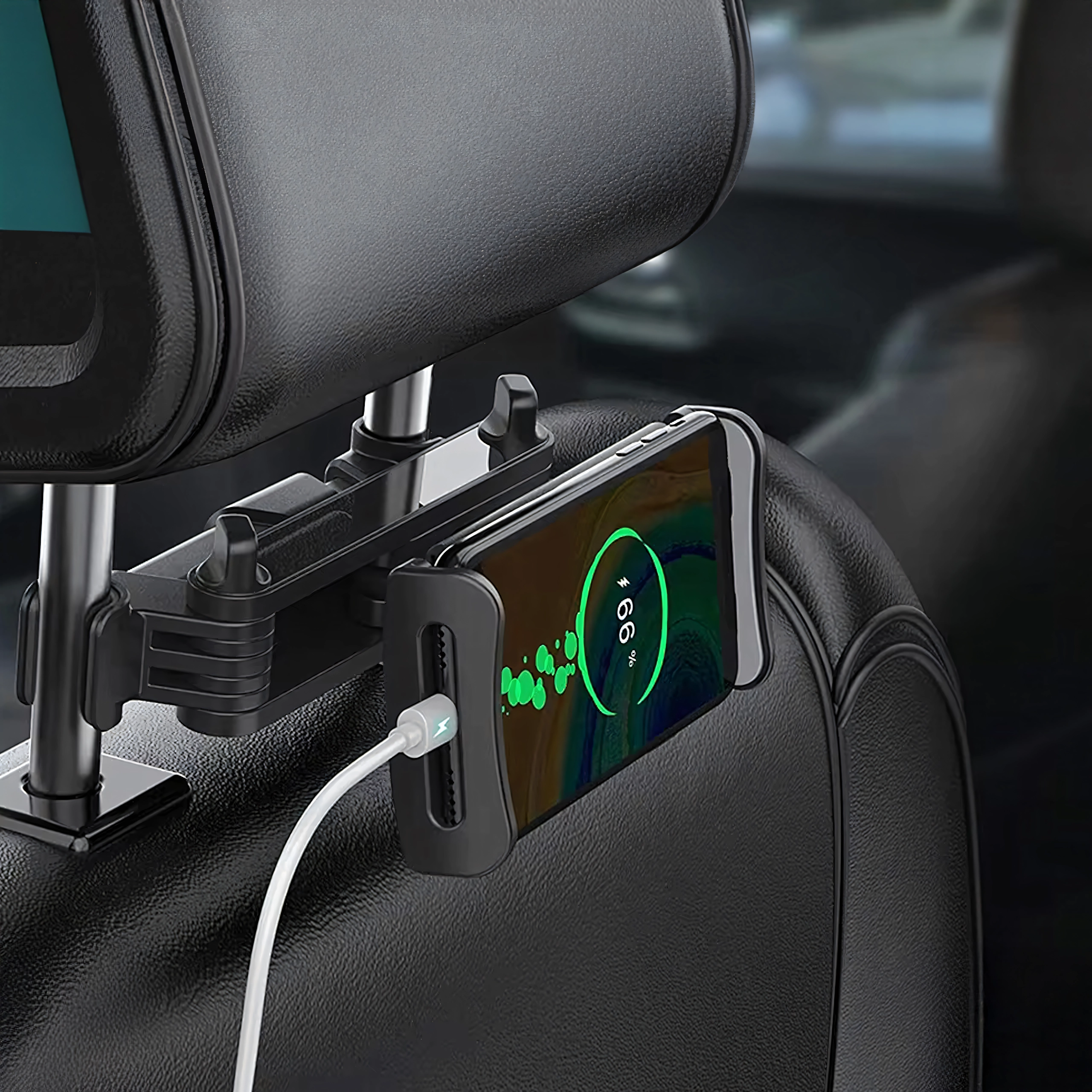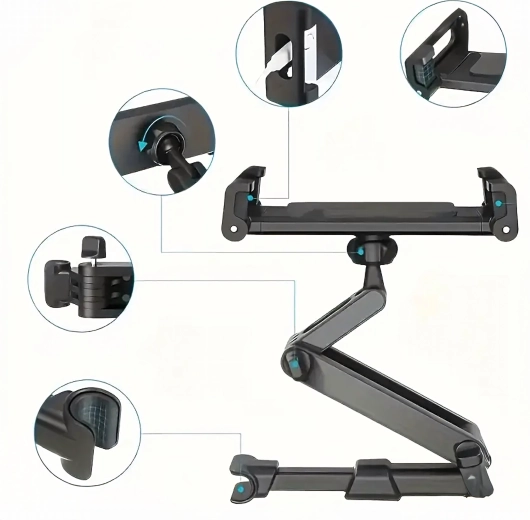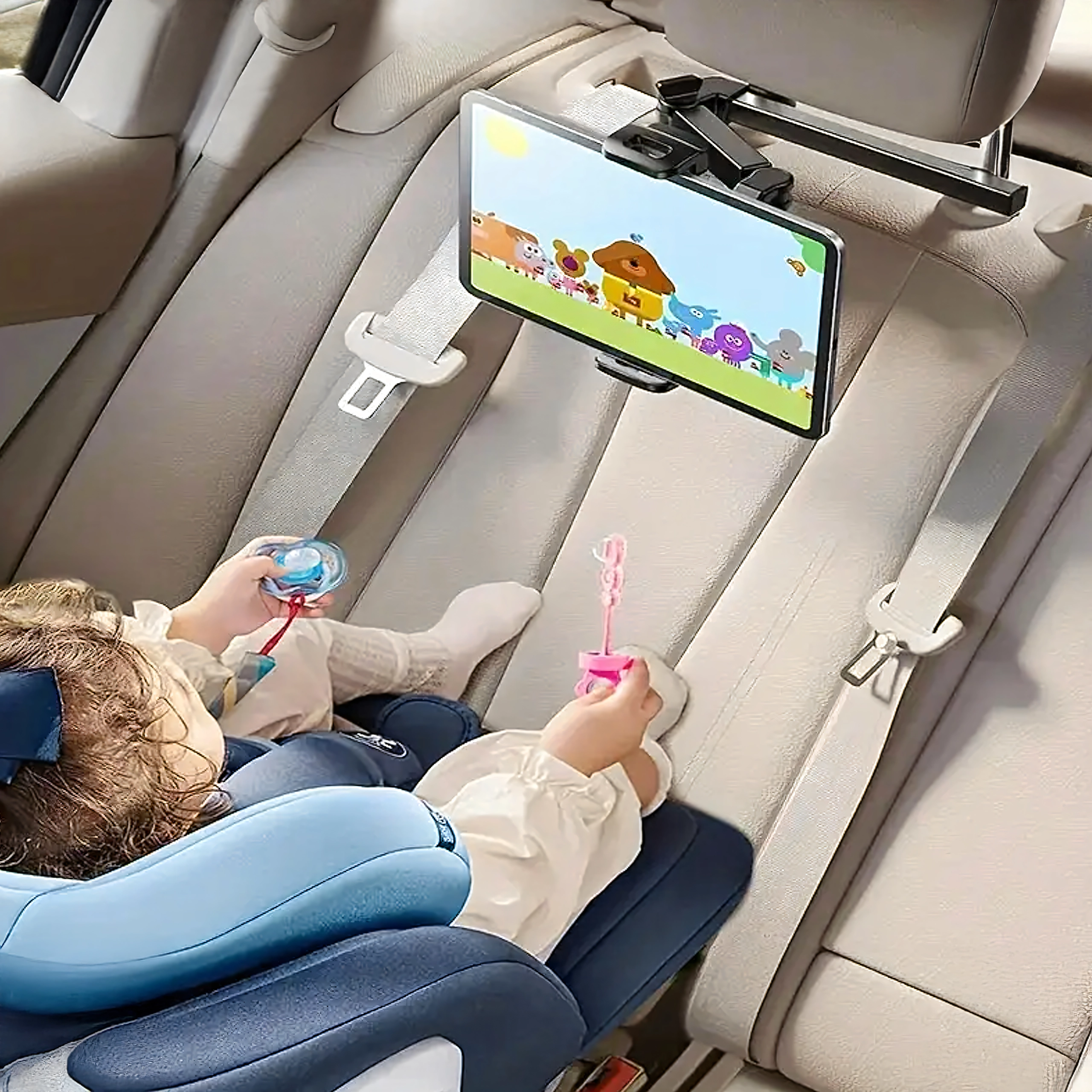 Universele hoofdsteunhouder die de achterbank verandert in een multimediacorner. Dankzij het scharnierontwerp en de kogelkop biedt hij 360° rotatie, brede compatibiliteit met telefoons en tablets en stevige, trillingsvrije bevestiging – ideaal voor films, games en leren onderweg.