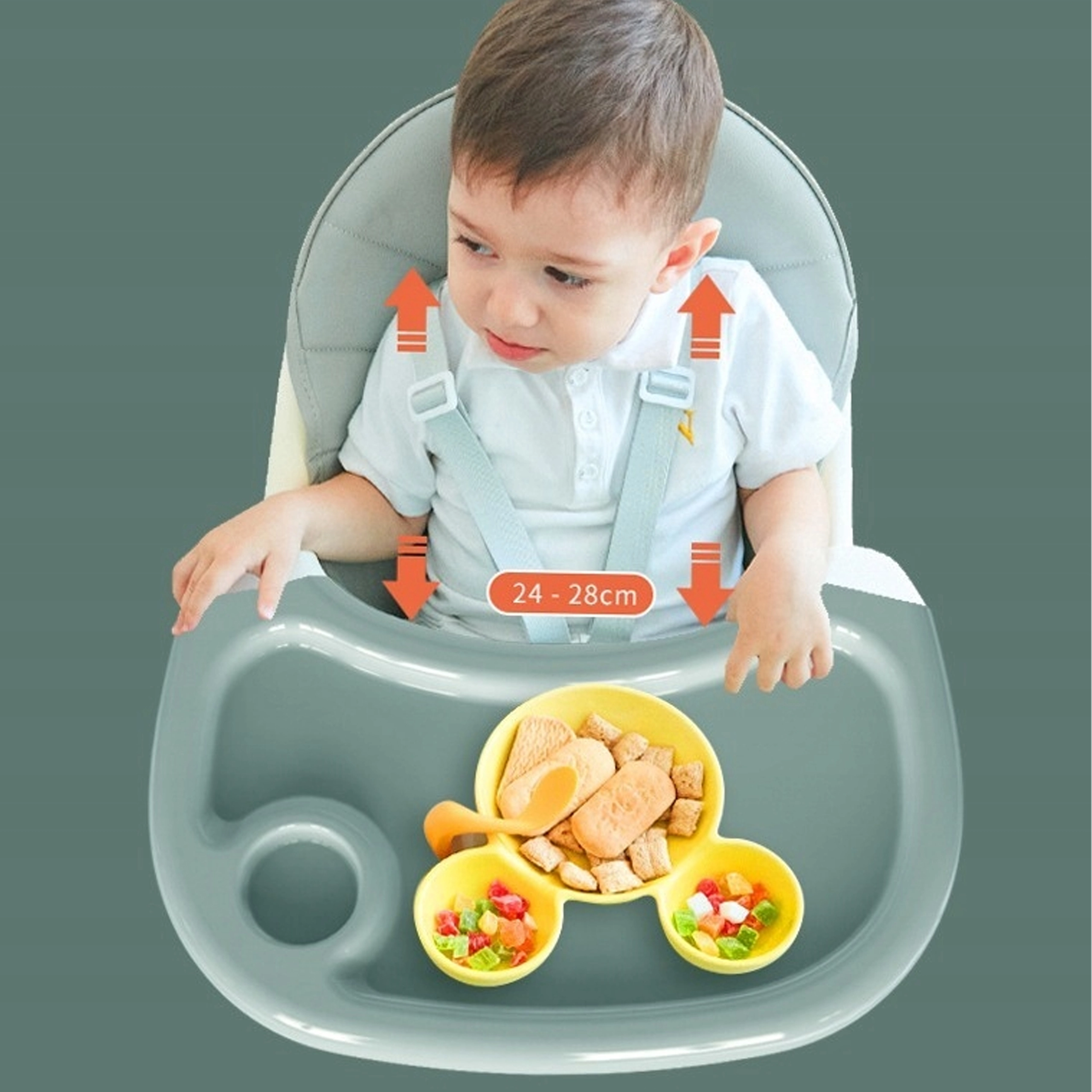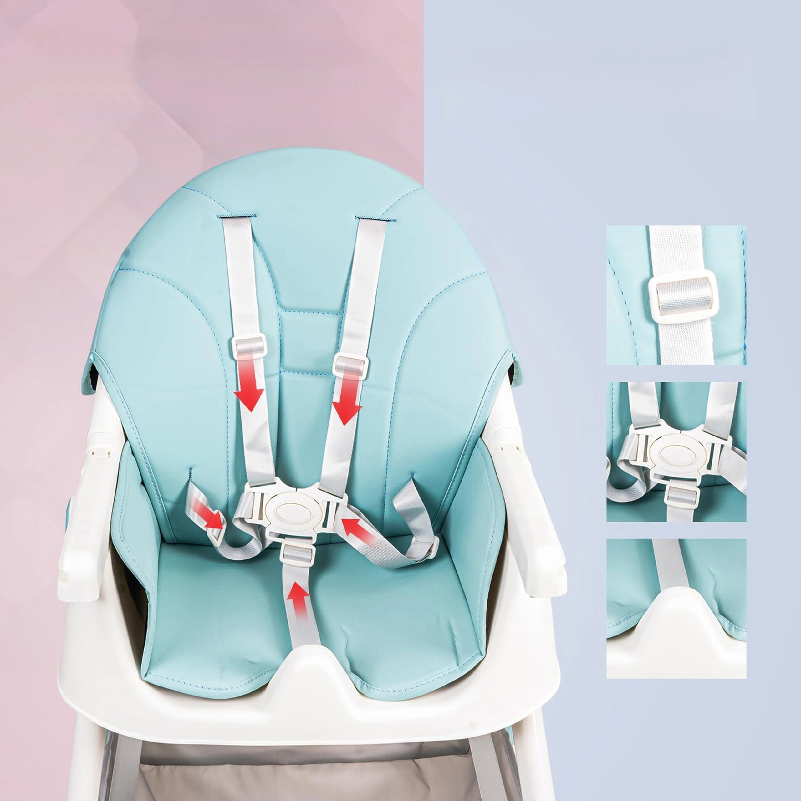 De gevormde zitting, zachte bekleding, 5-punts gordel en het tussenstuk houden je kind stabiel en comfortabel tijdens eten en spelen.