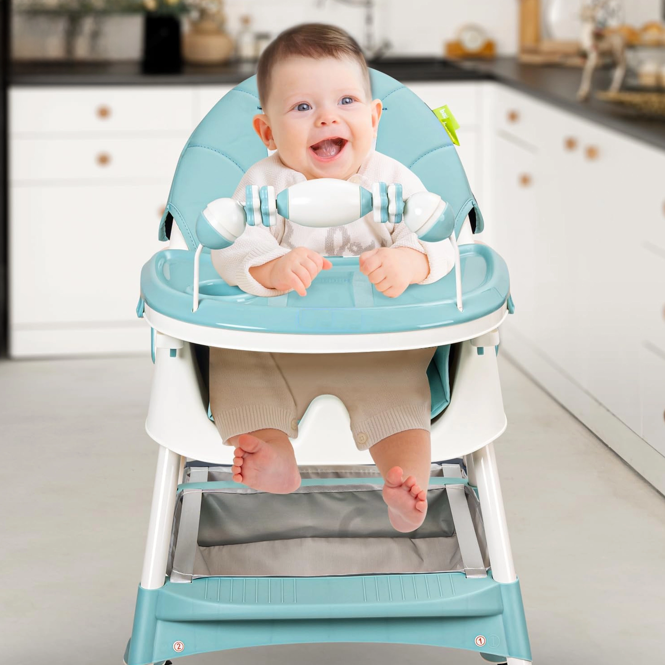 Deze veelzijdige 3-in-1 kinderstoel past zich eenvoudig aan de behoeften van je kind aan: van een hoge stoel om te voeden tot een losse lage stoel bij een tafeltje. Dankzij de snelle ombouw zonder gereedschap wijzig je in een handomdraai de configuratie en hoogte. Het afneembare blad is makkelijk schoon te maken en de geïntegreerde bekerhouder houdt drankjes op hun plek.