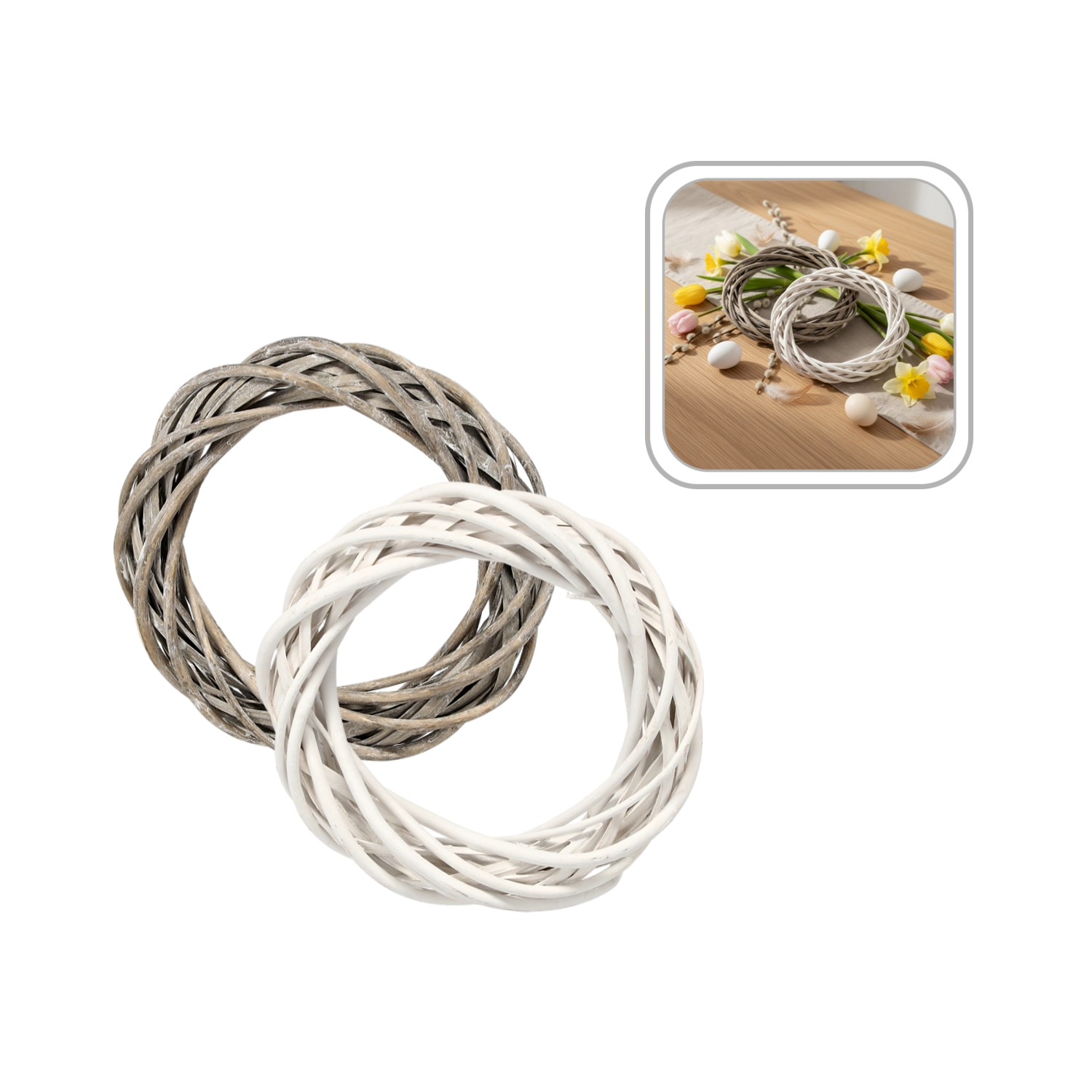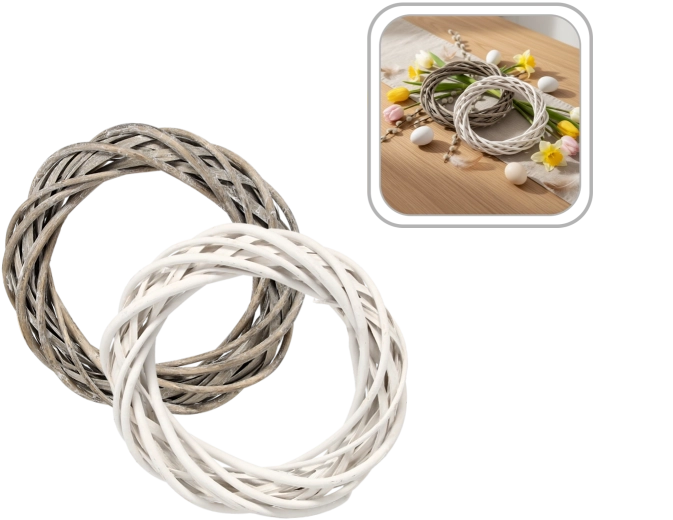 Universele rotan krans met een diameter van 20 cm in witte of grijze kleur, ideaal als basis voor seizoensarrangementen, bruidsdecoraties en kerstversiering. Dankzij het natuurlijke uiterlijk, de kwalitatieve afwerking en het lage gewicht is hij gemakkelijk op te hangen aan deuren en muren en past hij perfect bij gedroogde bloemen, linten en lichtslingers.