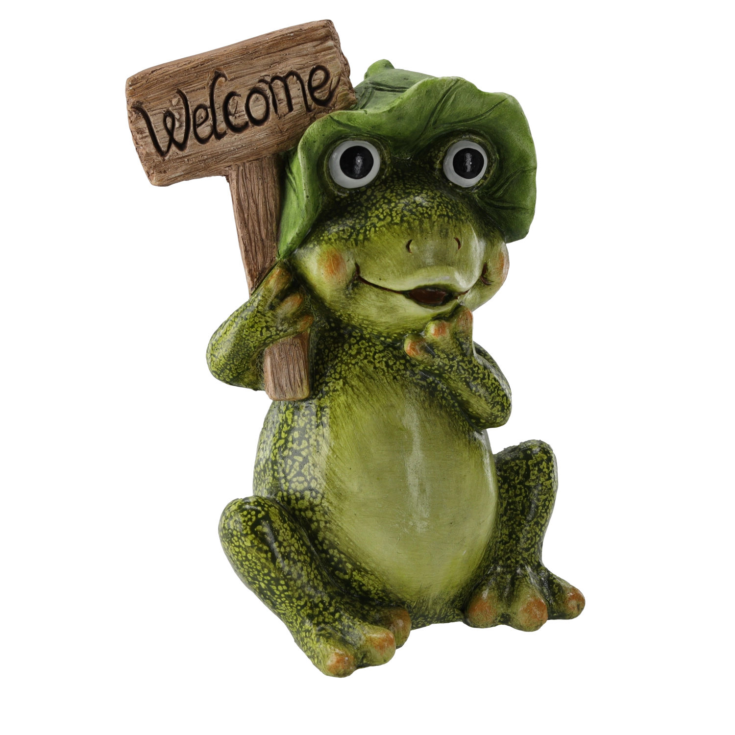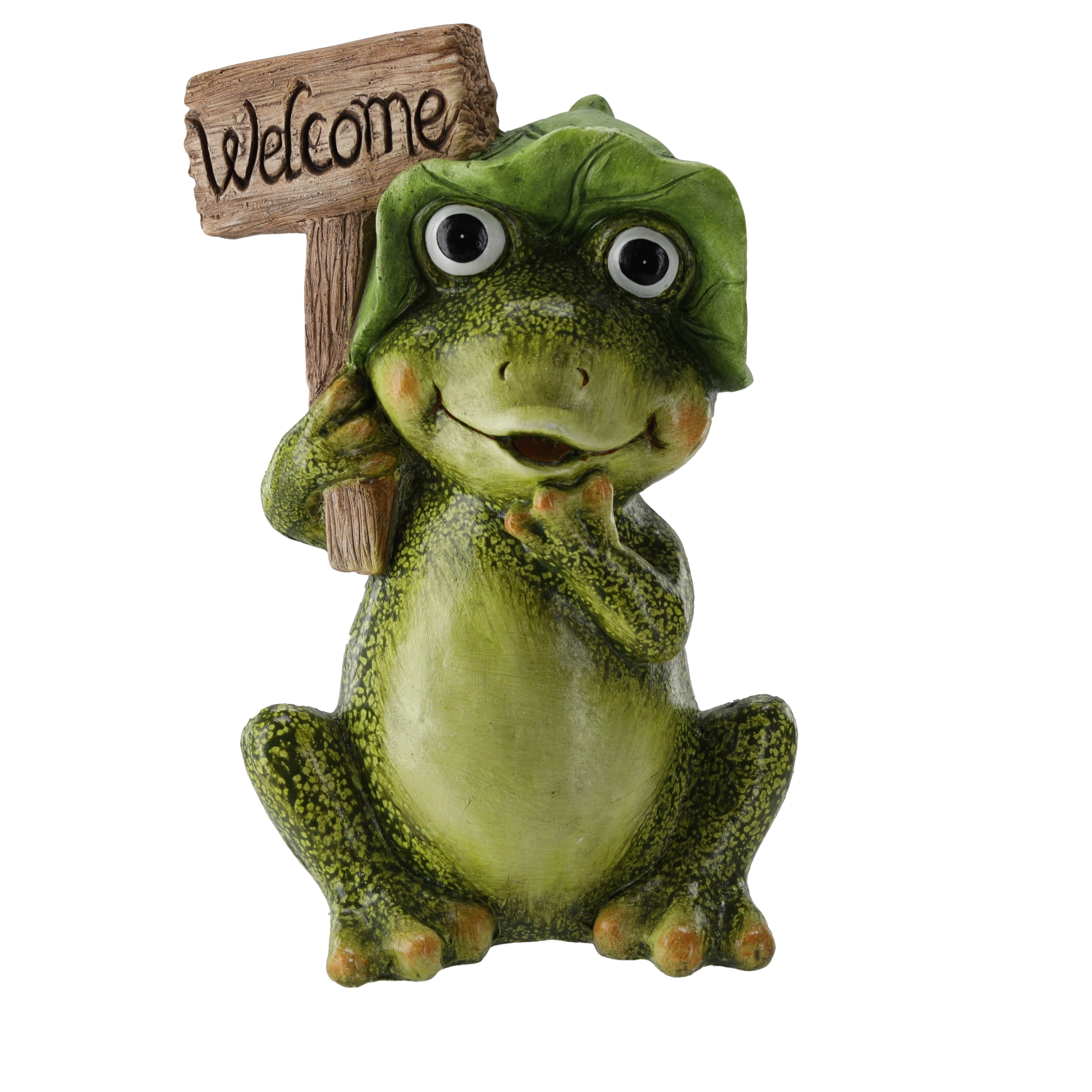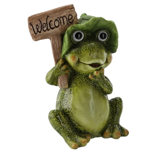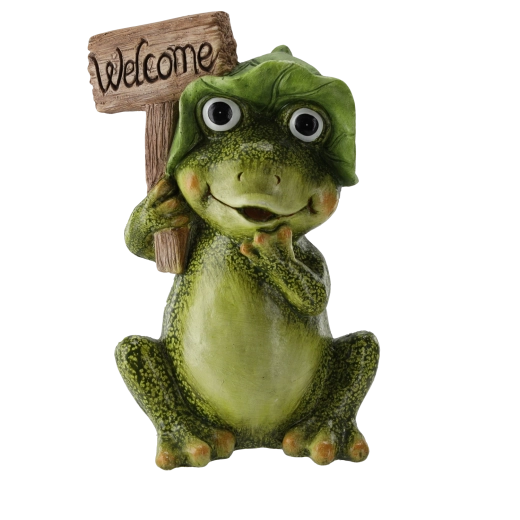 Verfraai je entree, bloembed of zithoek met deze charmante decoratie – een zittende kikker met het welkomstbord WELCOME. De hoogwaardige afwerking met gedetailleerde textuur en opvallende kleuren maakt het tot een echte blikvanger die zowel jou als je bezoekers zal bekoren.