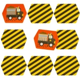 Hexagonale kaarten met fel oranje achtergrond en dieren op bouwmachines vergroten de interesse van het kind in leren en ontdekken.