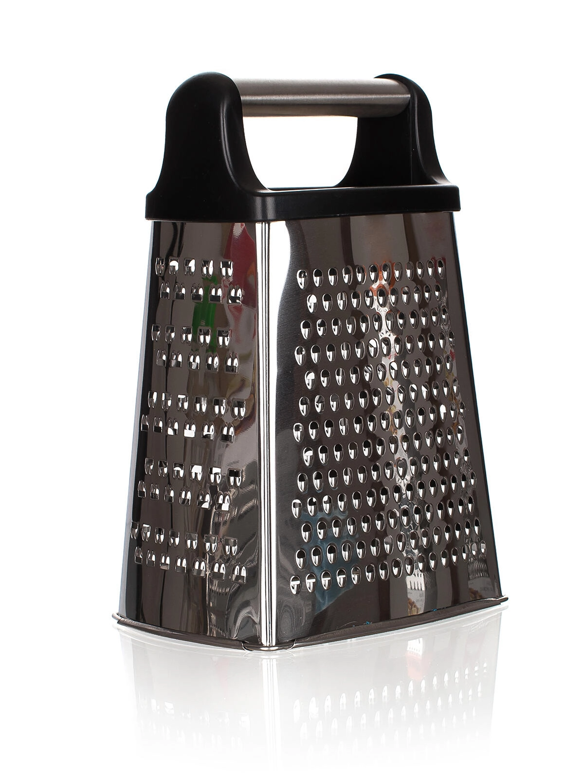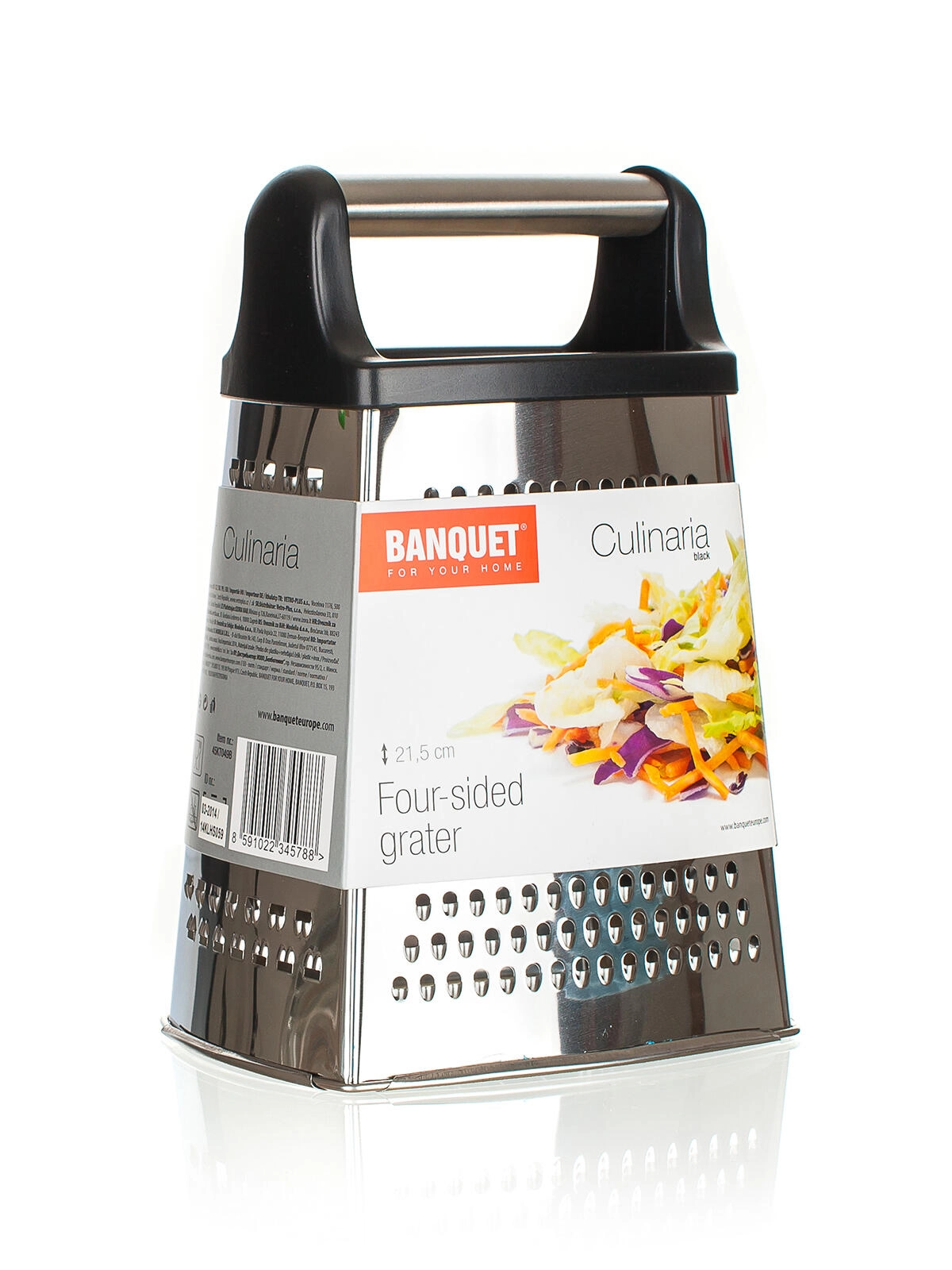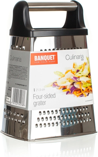 Praktische vierzijdige A‑vormige rasp met een hoogte van 21,5 cm voor dagelijks snijden en raspen. Biedt verschillende grofheden voor kaas, groenten en citrusschil, heeft een comfortabele plastic handgreep en een duurzame roestvrijstalen behuizing voor eenvoudig reinigen en een lange levensduur.