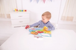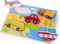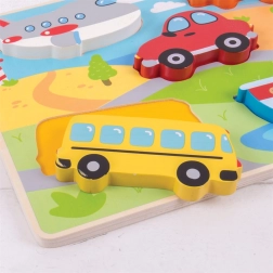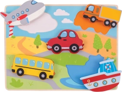 Ontdek de wereld van vervoer op een speelse manier. De houten inlegpuzzel met vliegtuig, auto, bus, vrachtwagen en boot motiveert kinderen om vormen en kleuren te herkennen en ontwikkelt tegelijk hun woordenschat. De stukjes zijn groot genoeg en prettig vast te houden voor kinderhanden.