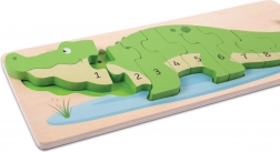 Ontdek een leuke manier van leren met de houten krokodil, waarbij kinderen de cijfers 1–10 koppelen aan de overeenkomstige stippen op de basisplaat. Elk puzzelstukje is kleurrijk, goed vast te pakken en ontworpen voor kleine handjes. De puzzel stimuleert logisch denken, oog-handcoördinatie en woordenschat bij het herkennen van vormen en kleuren.