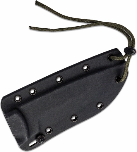 Het G10‑composiethandvat in zwart‑groene uitvoering heeft 3D‑frezen voor een zekere grip, ook met handschoenen of natte handen. Een praktische koordoog vergroot de mogelijkheden voor zekeren en dragen. Bij de levering is een gevormde kydex schede inbegrepen voor veilig en snel trekken.