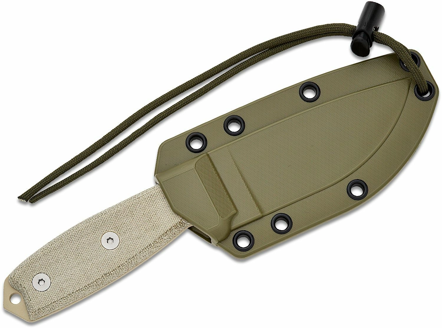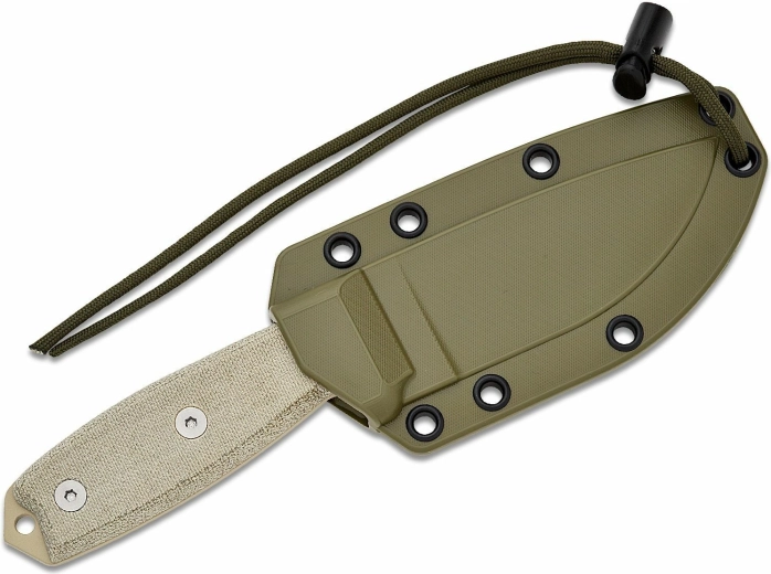 De Micarta handgreep in zandbruin biedt een zekere grip, ook met handschoenen en in natte omstandigheden. Het uiteinde van de greep is uitgerust met een oog voor paracord en een praktische glasbreker. Inbegrepen is een groene kunststof schede OD Green, die het lemmet beschermt en comfortabel dragen mogelijk maakt.