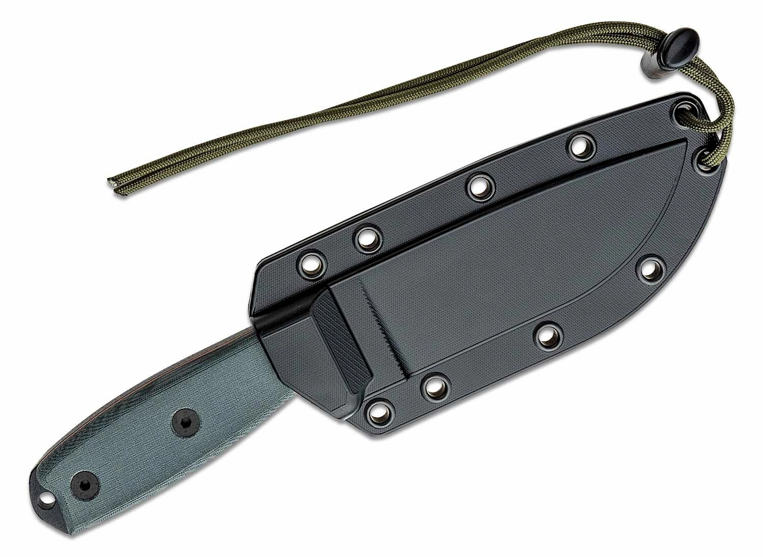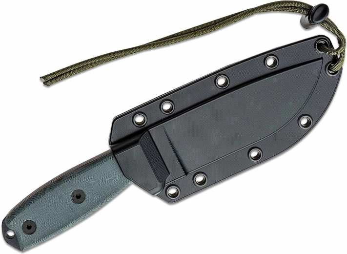 De handgreep van Micarta in grijs ligt uitstekend in de hand, biedt een zekere grip ook onder zware omstandigheden en heeft aan het uiteinde een koordoog. De set bevat een zwarte kunststof schede met bevestigingsoptie aan de uitrusting, zodat je het mes altijd veilig en comfortabel bij de hand hebt.